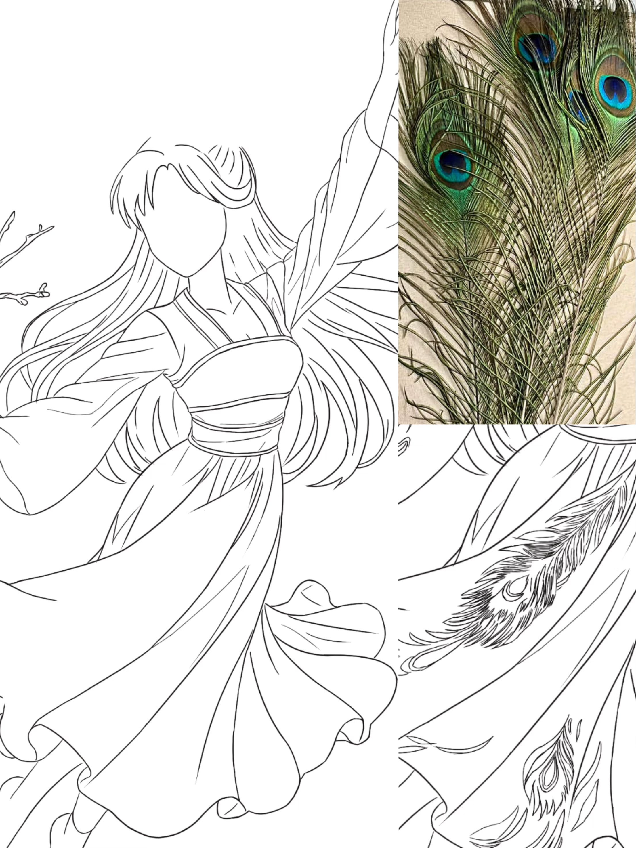 もちろん実物は現存していませんが……今回私が描いた図をご覧いただければ、衣装が完成した際に孔雀の尾の黒いラインがすべて金糸で縫い込まれ、さらに青・緑・紫の羽毛が加わって、どれほど豪奢に輝くのかを想像していただけると思います!