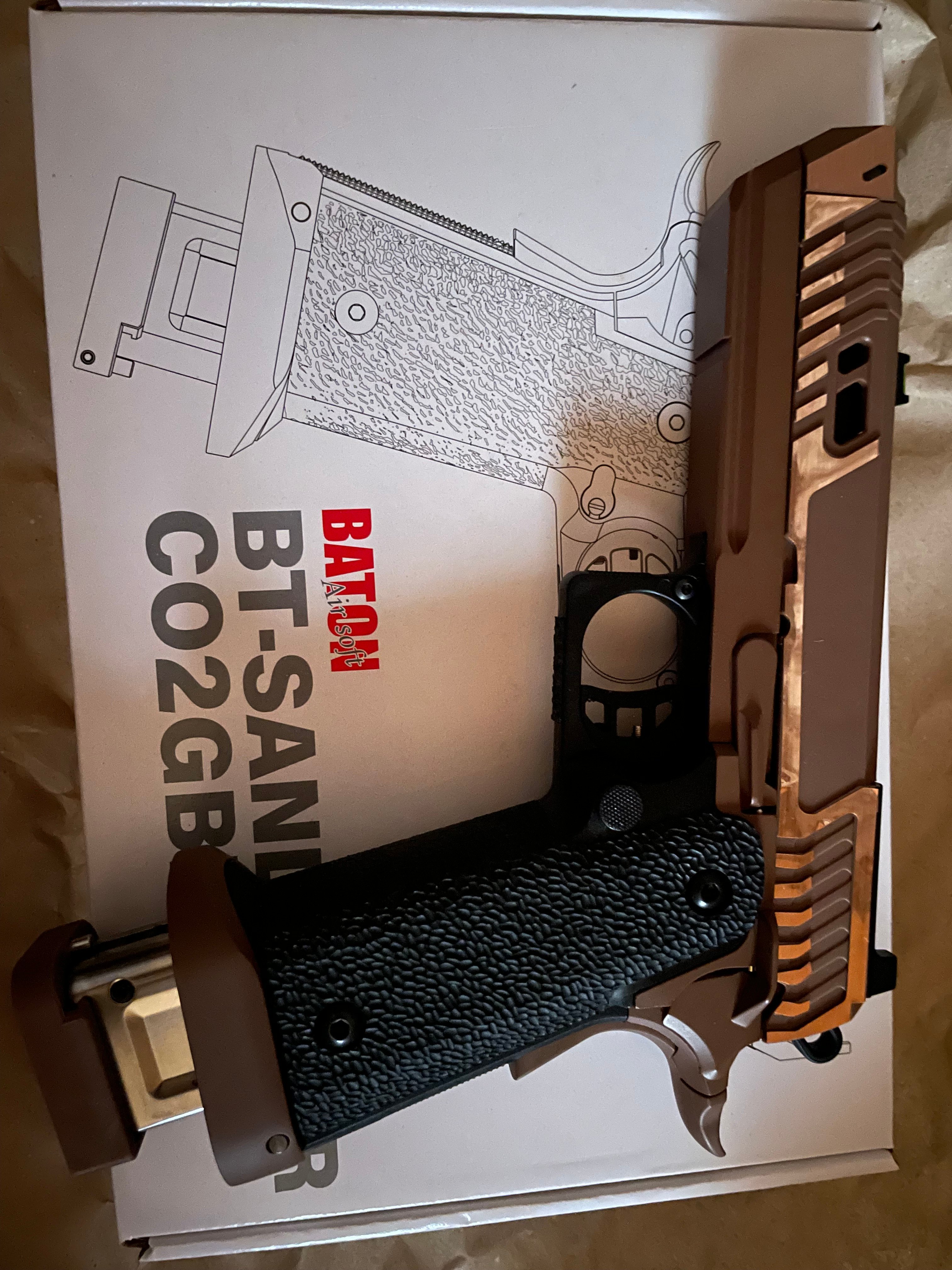 しかし、実物を手にして、タンカラーのスライドが渋みがあって気に入りました。手に持ったグリップの感触、重さも、元がレースガンだけあって操作しやすいです。見た目も素晴らしく買ってよかったと思いました🔫