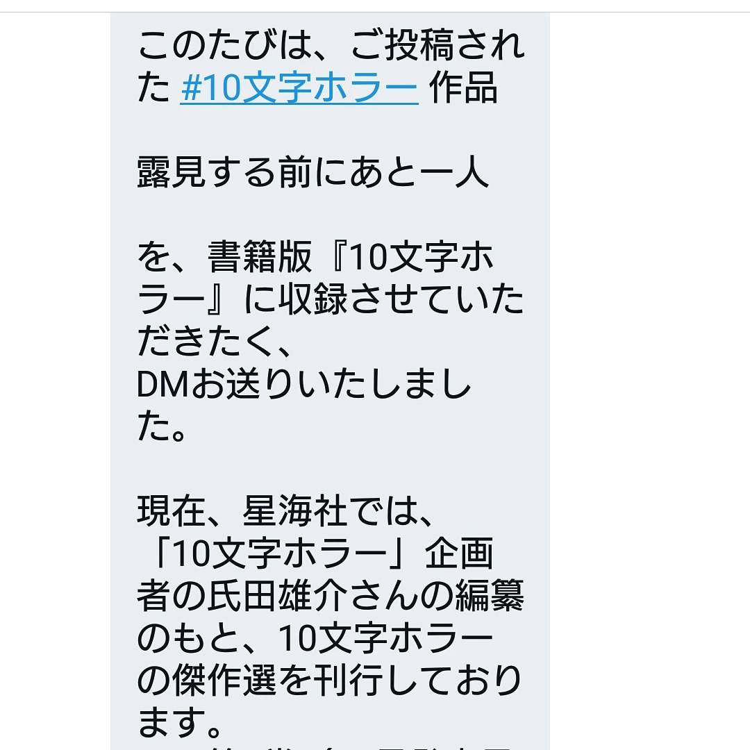 Twitterで投稿した10文字ホラーが書籍版に収録されることが決まったようです。