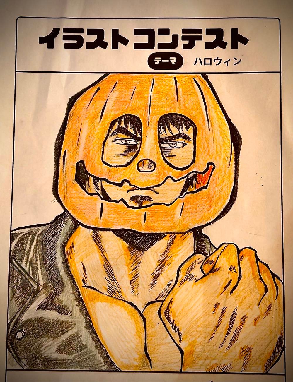 どこかでみたことあるようなマッチョが、カボチャをかぶってポージング。