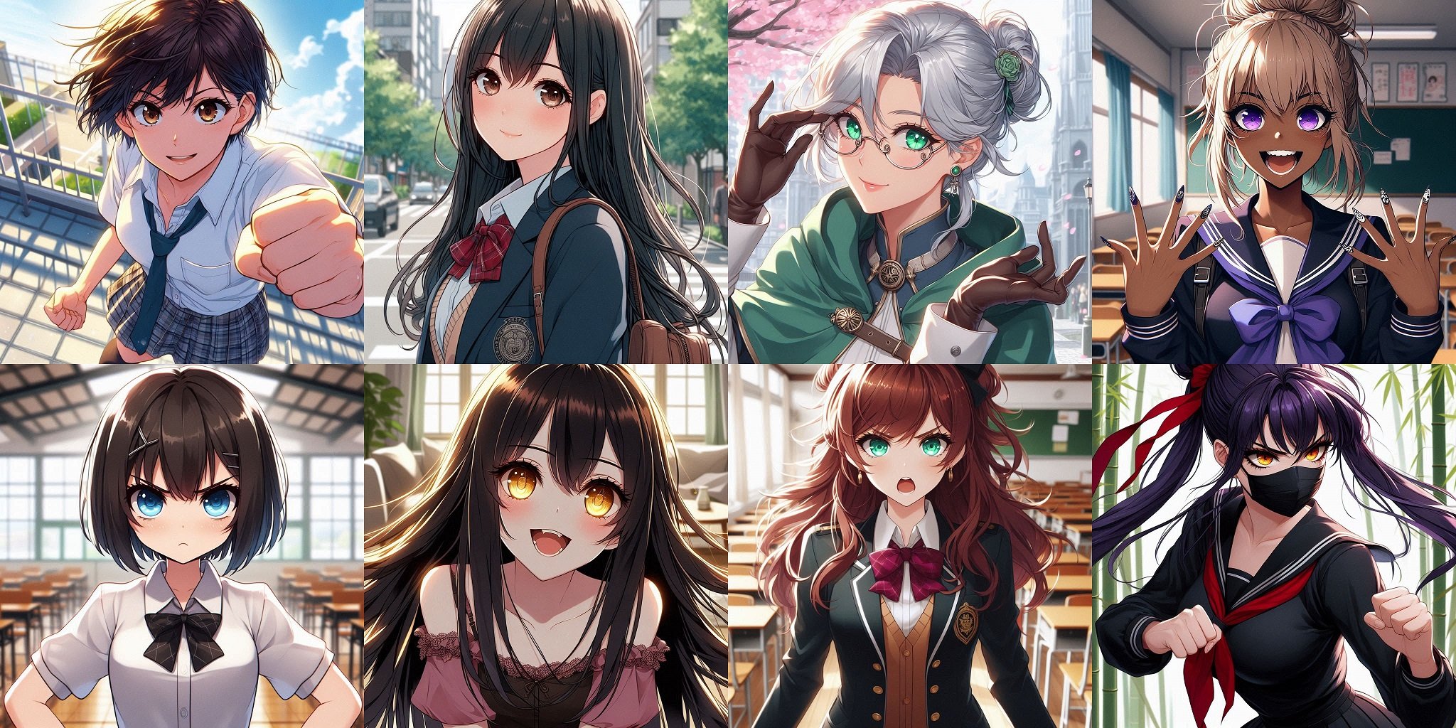 添付のAI画像は第三章までの主要キャラ(現時点で未登場のキャラ含む)詰め合わせです。いきなり一気に登場したりはしませんので、ご安心ください。二章終盤までは上段の4人がメインです。