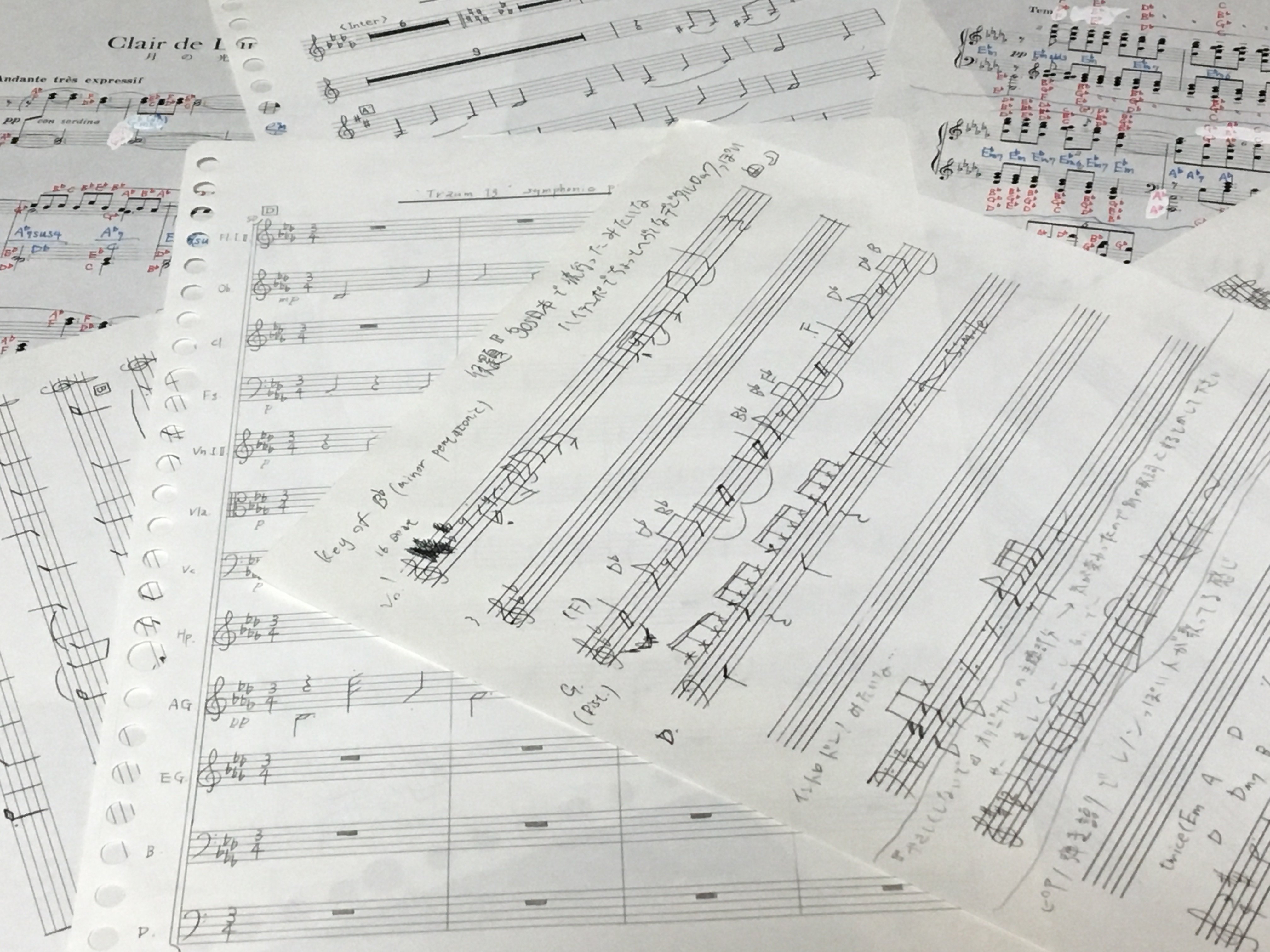 画像は当時書き留めた作曲メモやら楽譜やらの一部です。ドビュッシー「月の光」をギターアレンジしようと悪戦苦闘した跡が見えますね😫