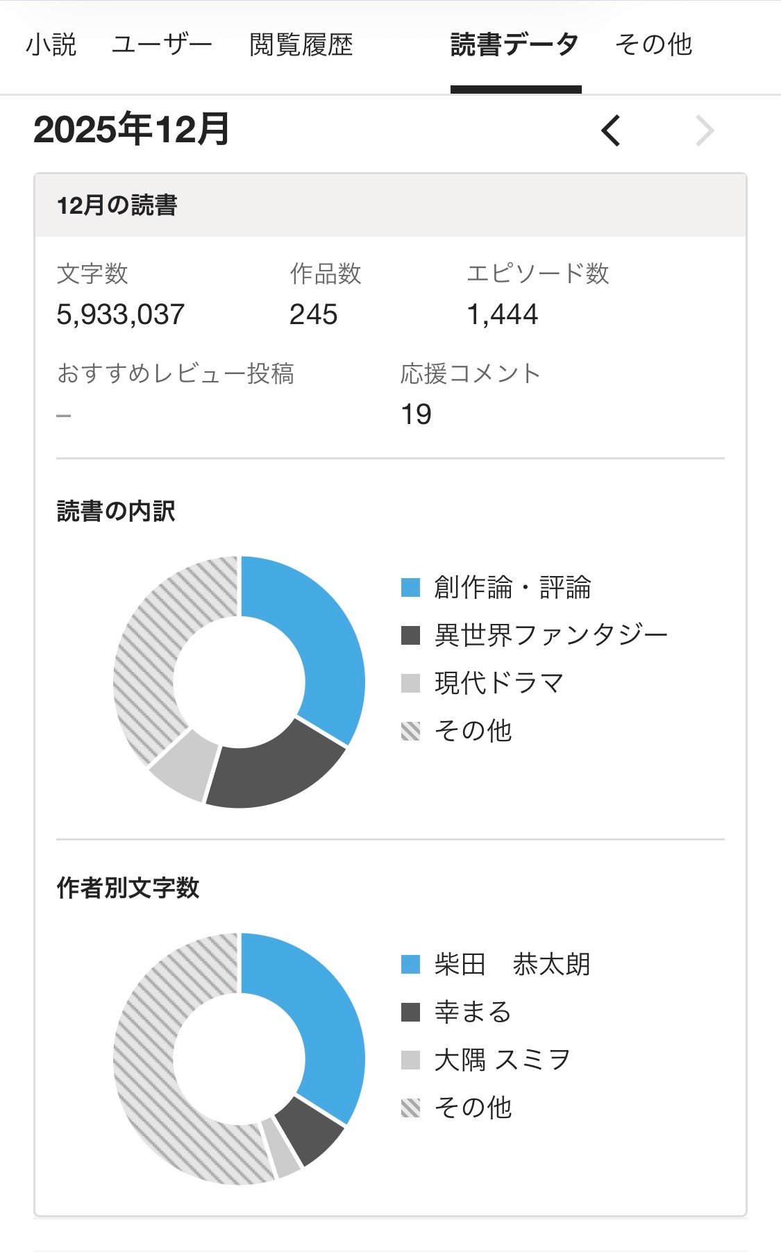 六百万には届かなかったけど。ほぼそれに近い数字を一月で読んでいる……。いやー、年末っていいですね暇が沢山あるので(それでも読みたいものが減っていかねぇのですが。