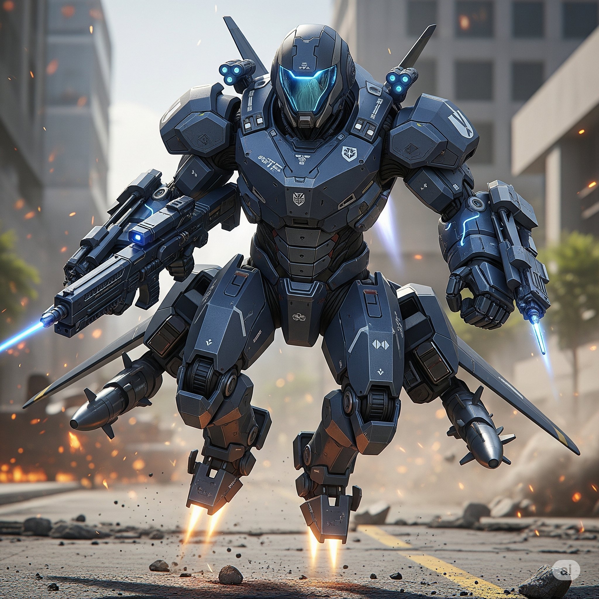 The limbs showcase its key feature: high-mobility combat. Large, articulated thruster units are attached to the hips and calves, enabling hovering and high-speed gliding. The feet are designed with deployable skids and smaller thrusters on the soles for stabilization during hover-mode.