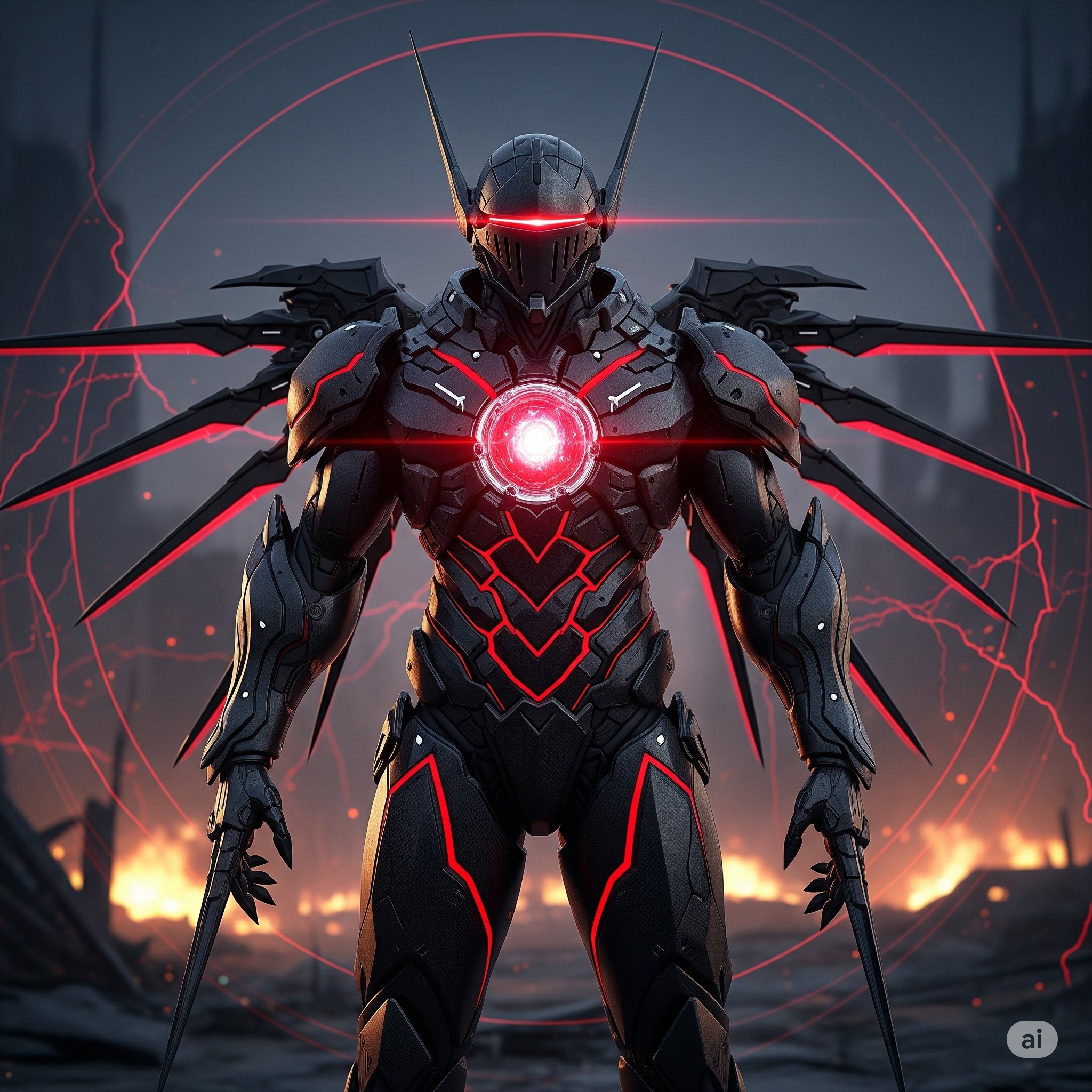 The armor is covered in intricate, geometric patterns and panel lines. Red light bleeds from the gaps between the armor plates.