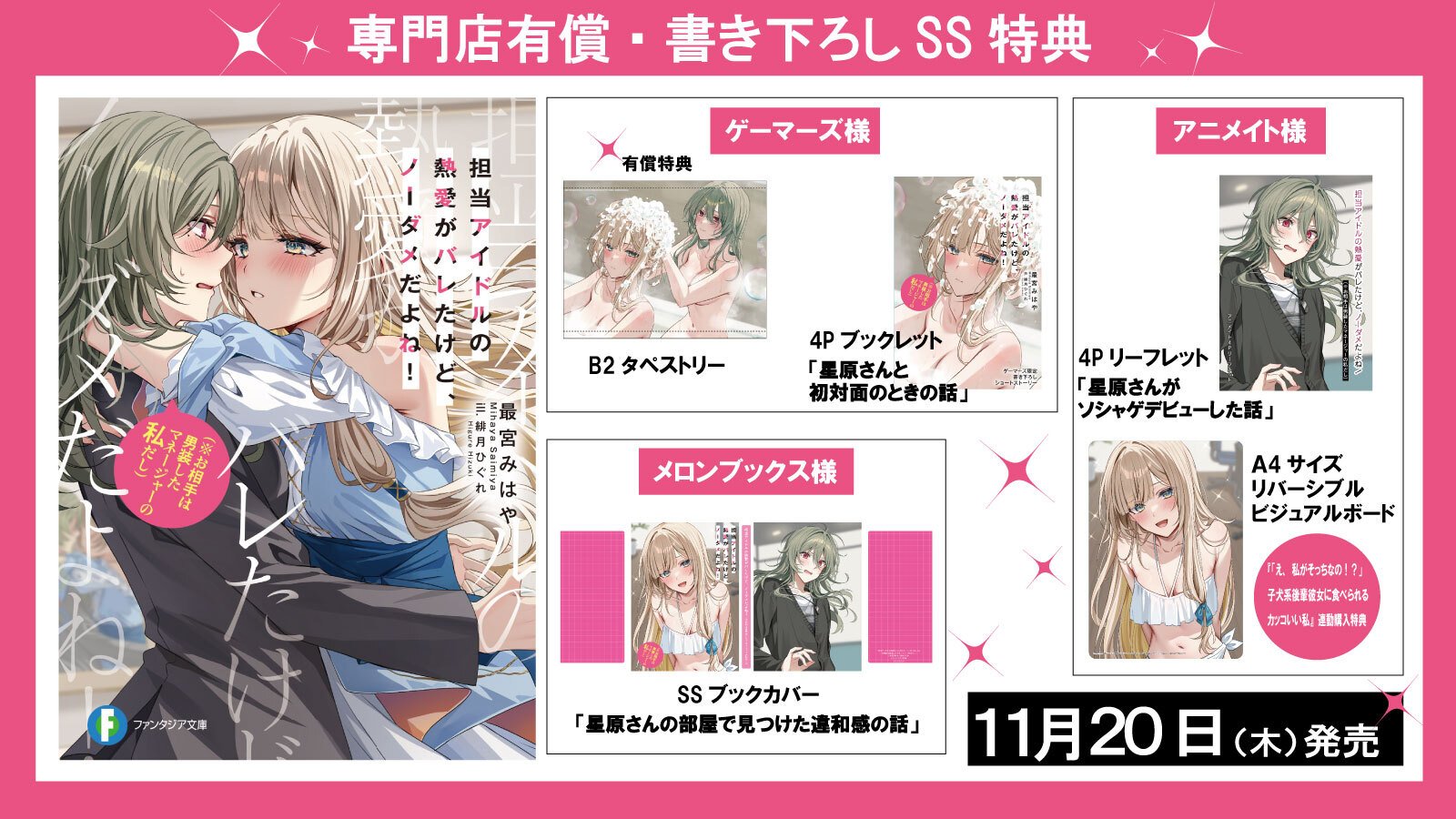 対象の作品、よく確認していただければわかると思いますが、大人気の作家様が同日に発売する百合作品で……恐れ多い!! とおののいております。