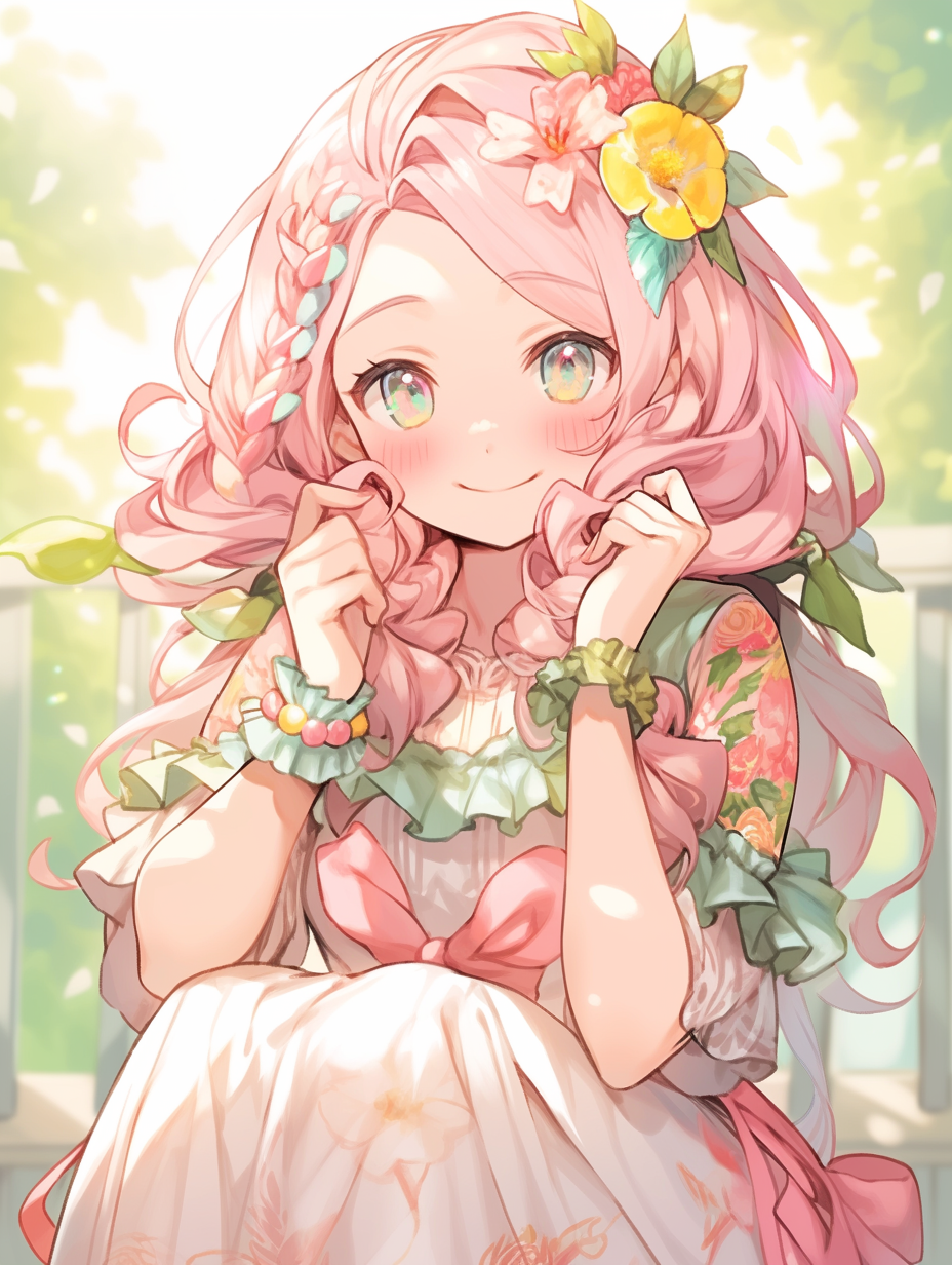 セレブ御用達高級ブティックで変身したあとのノアナです。なのでゆるふわ髪と、花柄のワンピースドレス(前リボン)とフリル付きボレロカーディガンです。