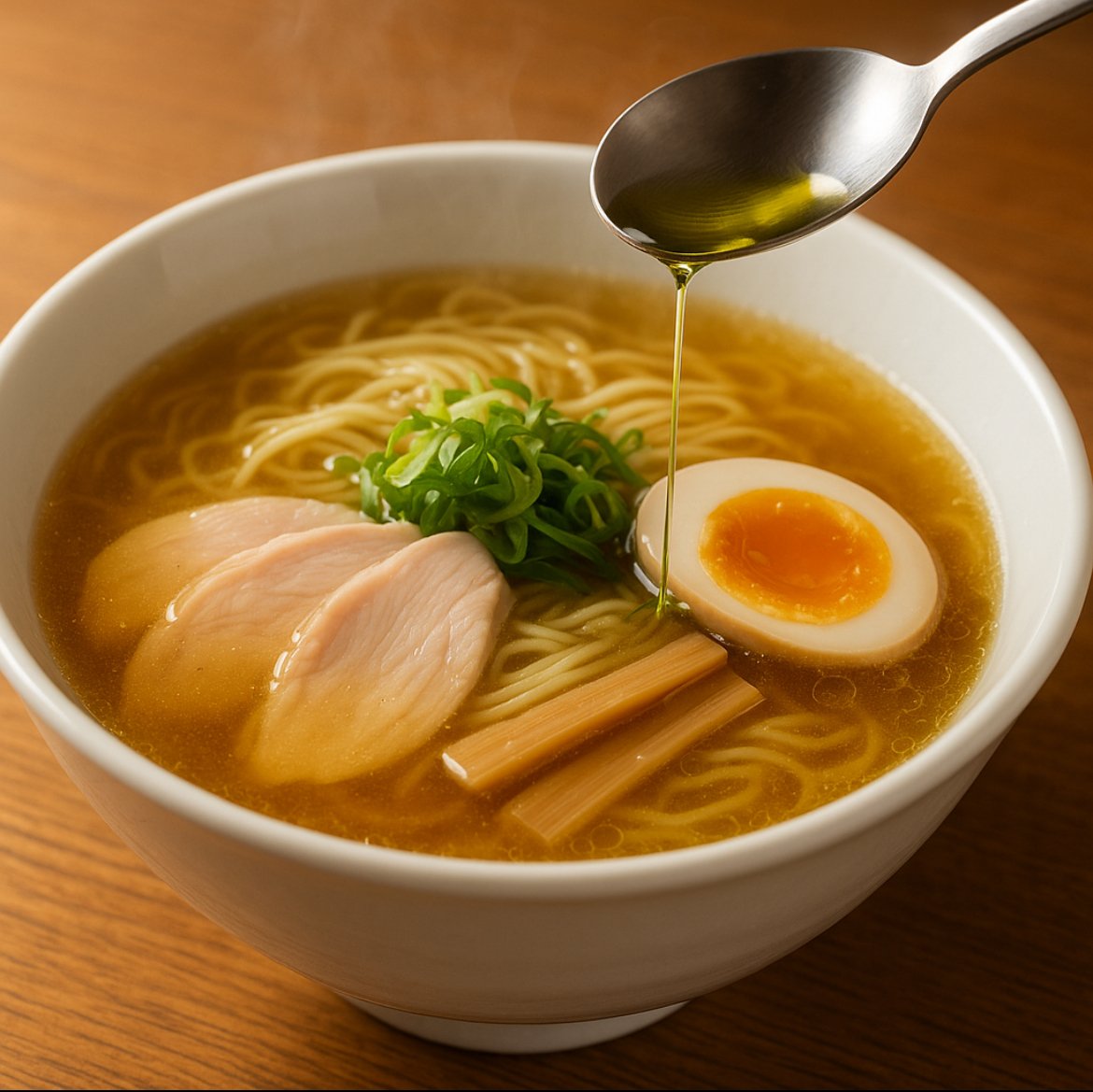 読後の“一手”もぜひ:レンゲの上に小さじ1のオイルをひと筋。同じスープでも、線がすっと太くなる体験をどうぞ。