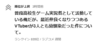まず初めに一昨日、プロローグを投稿した「普段高校生ゲーム実況者として活動している俺だが、最近仲良くなりつつあるVTuberが3人とも幼馴染だった件について。」がみるみるうちにブックマーク数を増やしていきあっという間にランキングに入っていて正直驚きを隠せません。