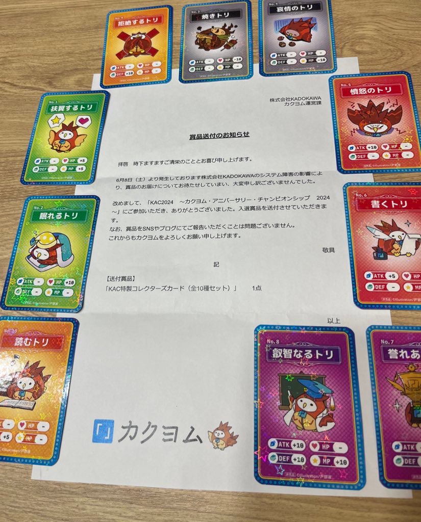 KAC2024ランカー賞の賞品、トリのコレクターズカード10種。