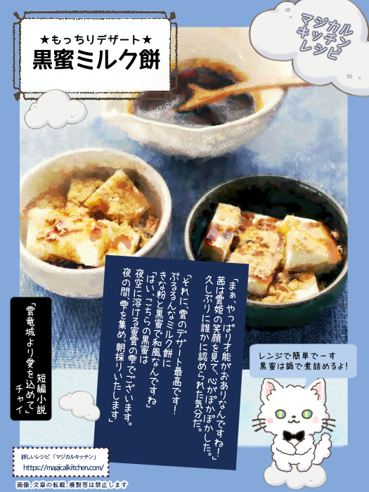 「雲の城を再生せよ!ゲームクリエーターの私、異世界でコンサルタントになりました」に出てくる「黒蜜ミルク餅」のレシピカードです。