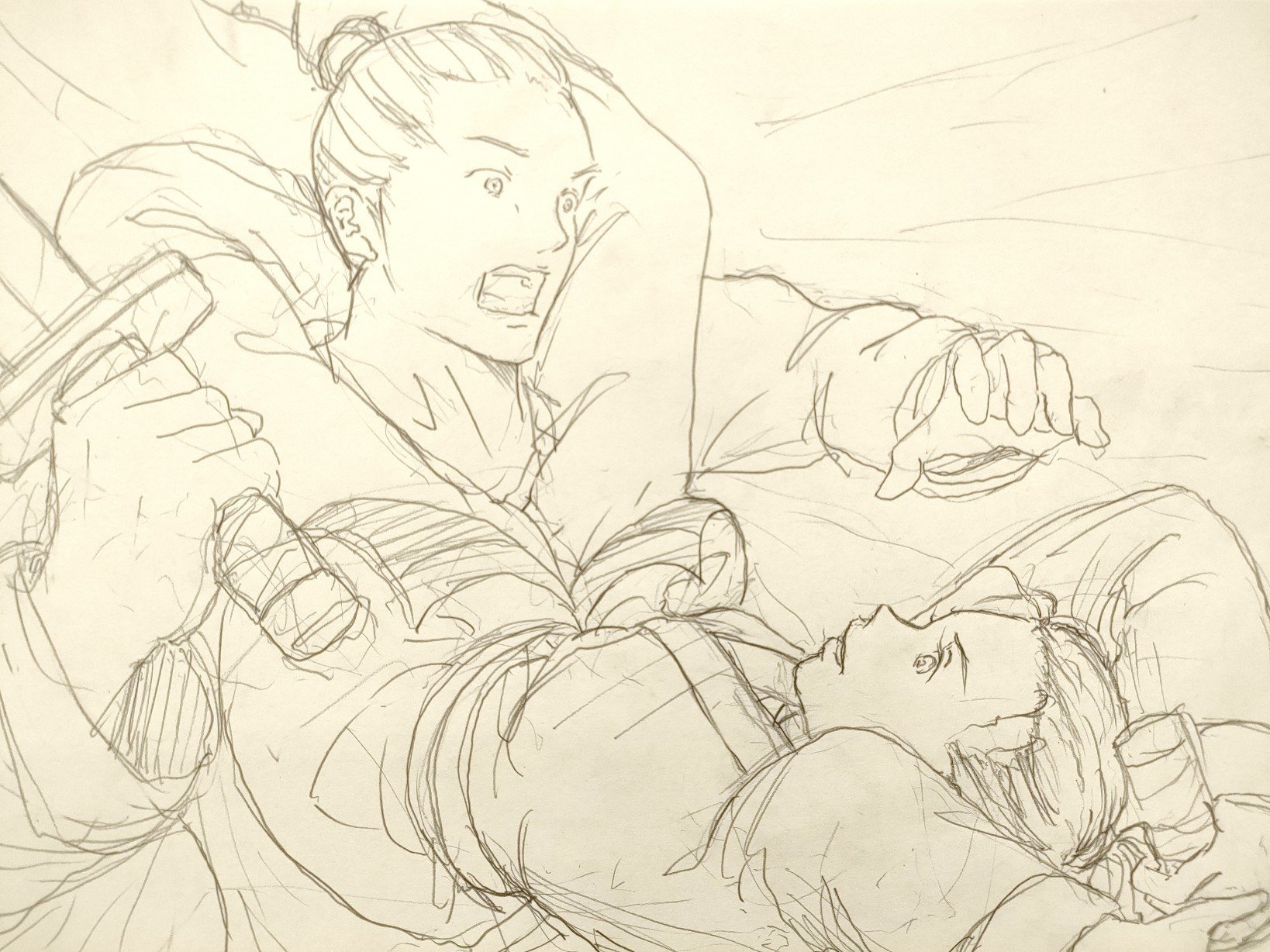 この場面、絵にしたらこんな感じかなあ、と気がつくと落書きしている始末。