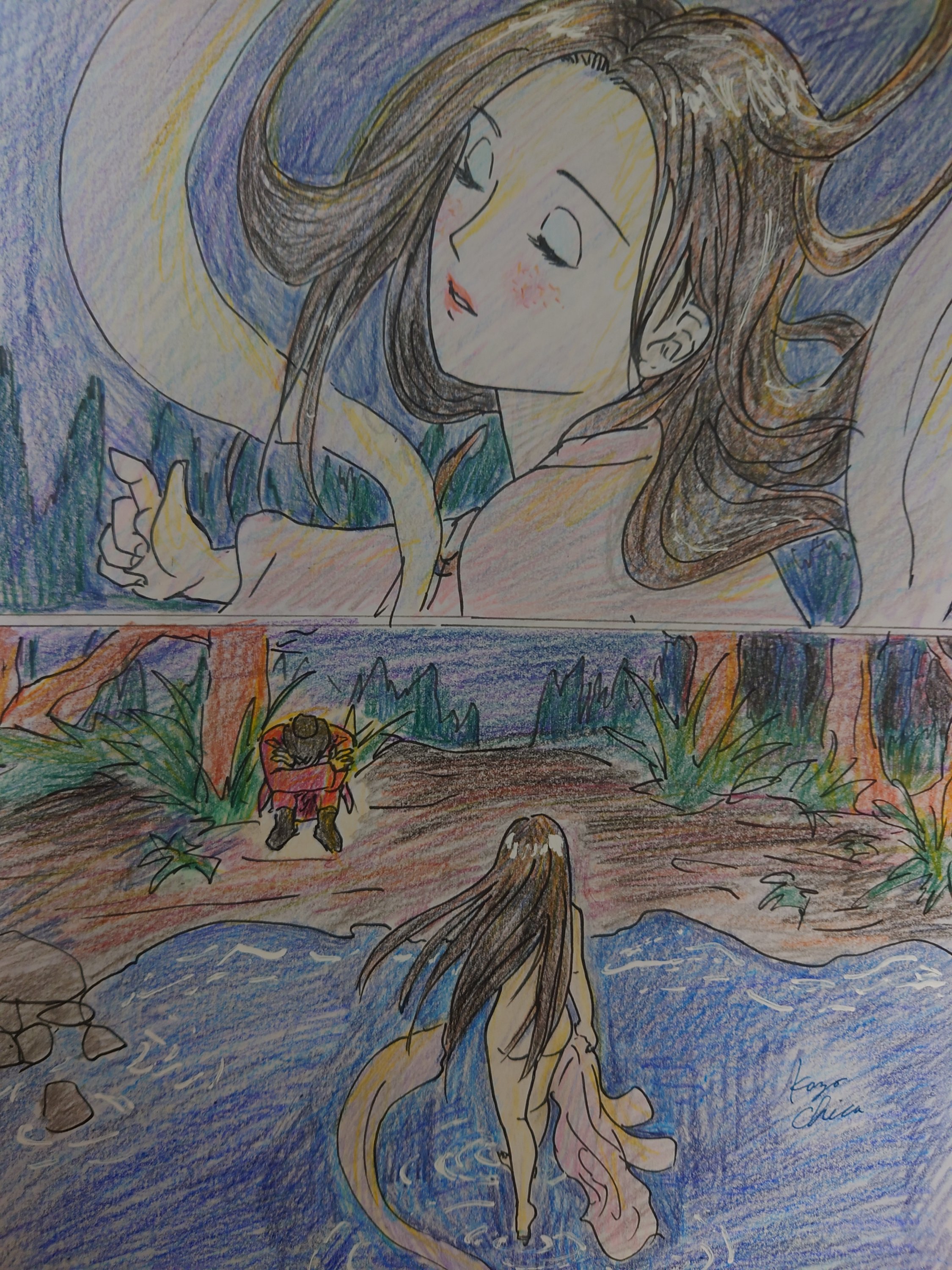 このシーン、この絵は、ずっと以前から、頭のなかに確固たるものとしてありました。神秘的な雰囲気をだすため、こだわって色鉛筆を塗り重ねました(・∀・)