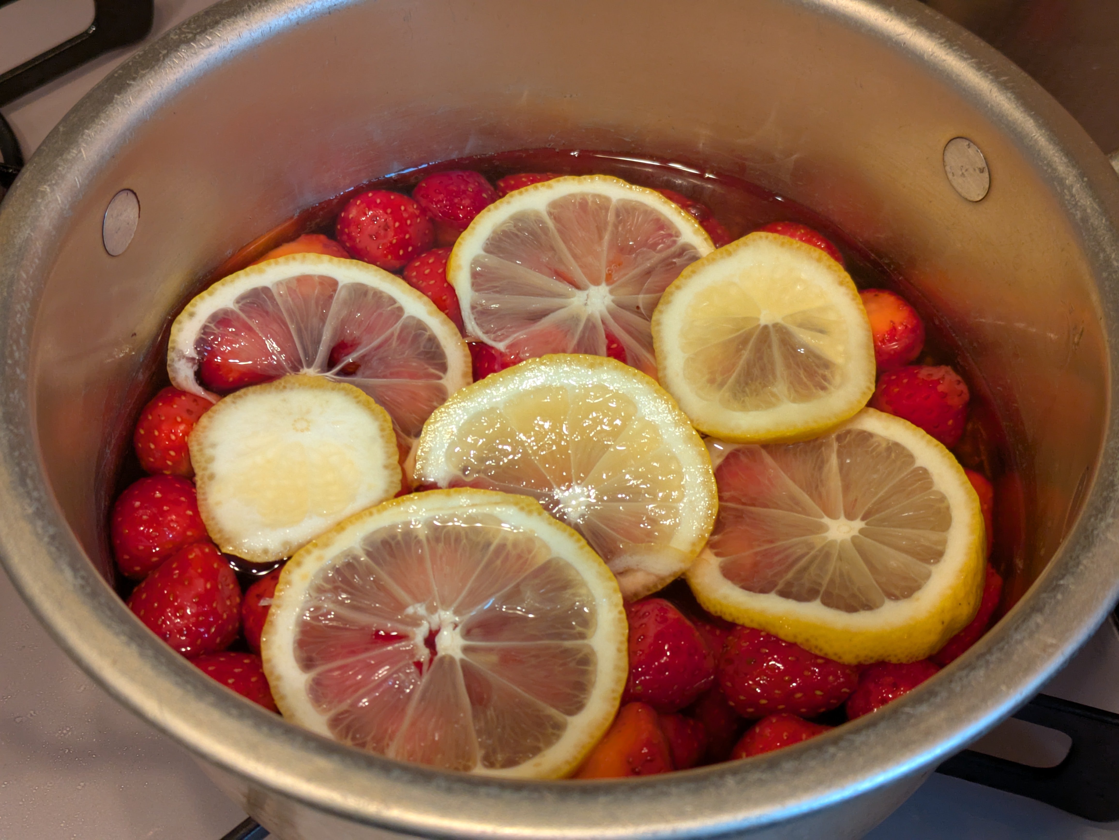 グラニュー糖まぶして放置したものにスライスしたレモンと白ワインを入れて、煮込みます。