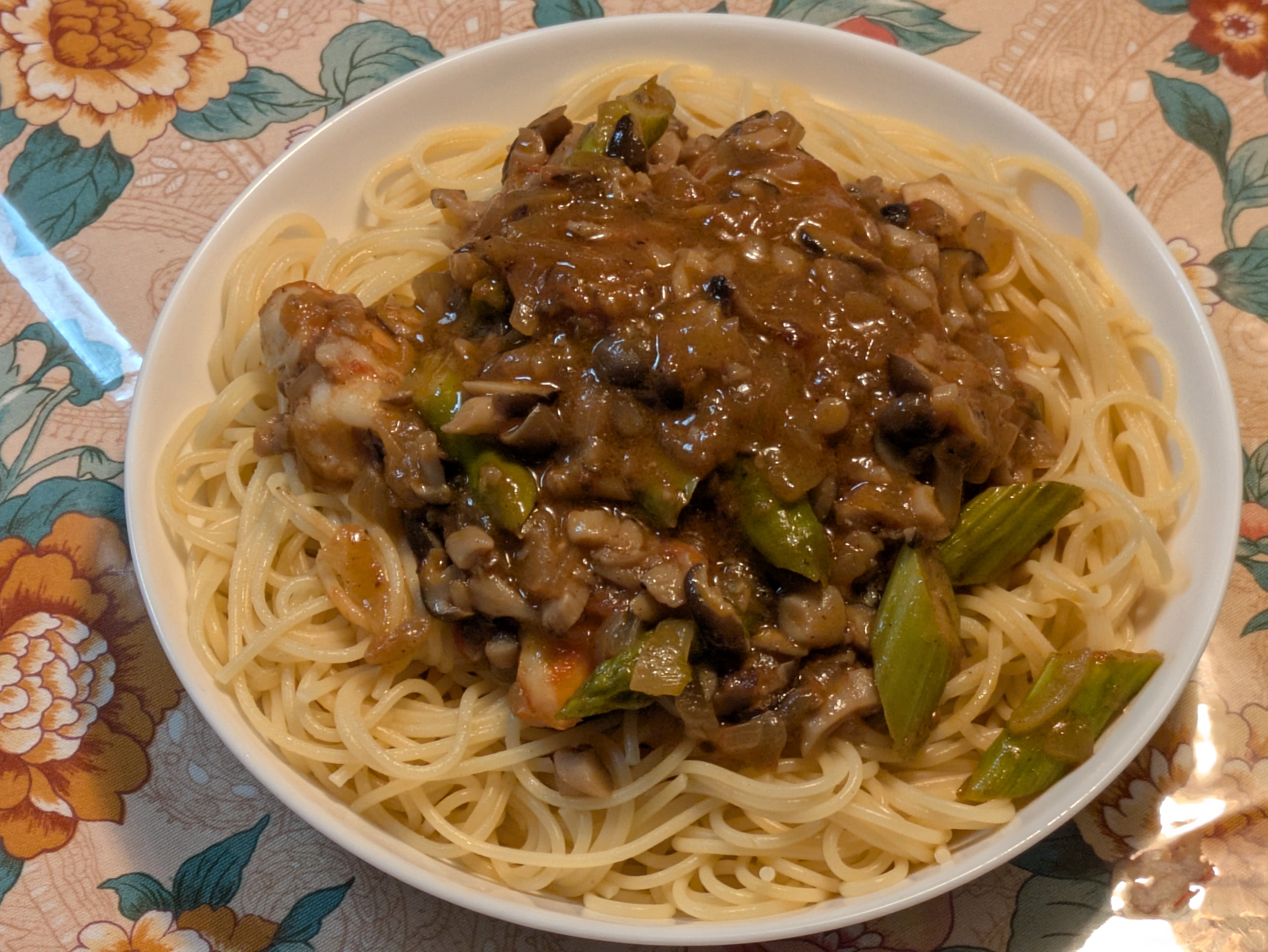 画像は、そうして完成したソースを茹で上がったパスタにかけたもの。