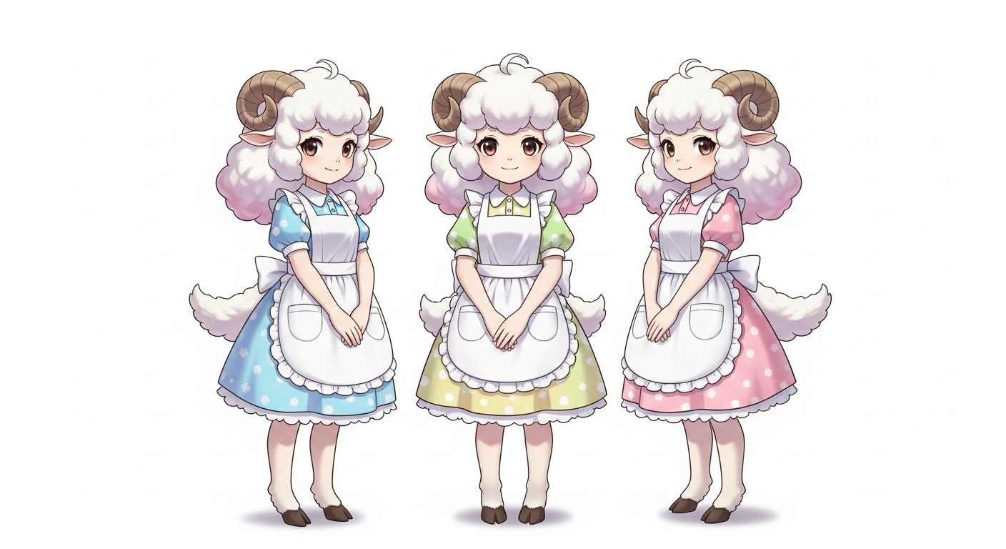獣人とは人の一部外見が動物の部位となっている人です。顔面や手足は人間と同じです。耳や目は元になった動物の特徴と一致します。以上を踏まえて、女性で3つ子の全身がわかる立ち姿のCGイラストを描いてください。年齢は10歳。焦茶色の瞳で、虹彩は羊と同じ形、肌の色は白。羊の角と尻尾があります。身長130cmくらい。それぞれパステルカラーで白いエプロンのエプロンドレスを着ています。髪の毛は綿菓子のようにふわふわで白、毛先が薄い桜色、肩くらいまでの長さです。