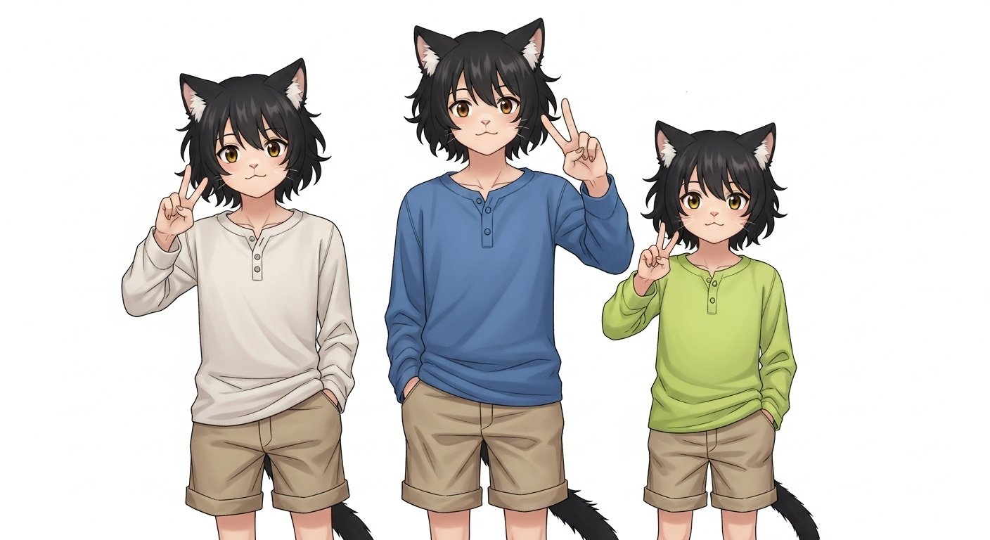 (獣人とは人の一部外見が動物の部位となっている人です。顔の形状は人と同じで動物の特徴はありません。手足は人と同じです。尻尾が追加されることがあります。耳や目の虹彩は元になった動物の部位と同形状です。以上を踏まえて、少年の3兄弟の全身立像のCG画像を描いてください。年齢は左から8歳、6歳、4歳。全員明るい茶色の瞳、虹彩は猫と同じ形、体色は白。黒猫の耳がある。それぞれヘンリーネックのシャツと半ズボンを着ている。シャツの色は左から生成り、ブルー、レモングリーン。ズボンの色はカーキ色。髪の毛は毛先がはねていて黒、肩くらいまでの長さです。3人全員ポケットから両手を出している。ピースをしている。)