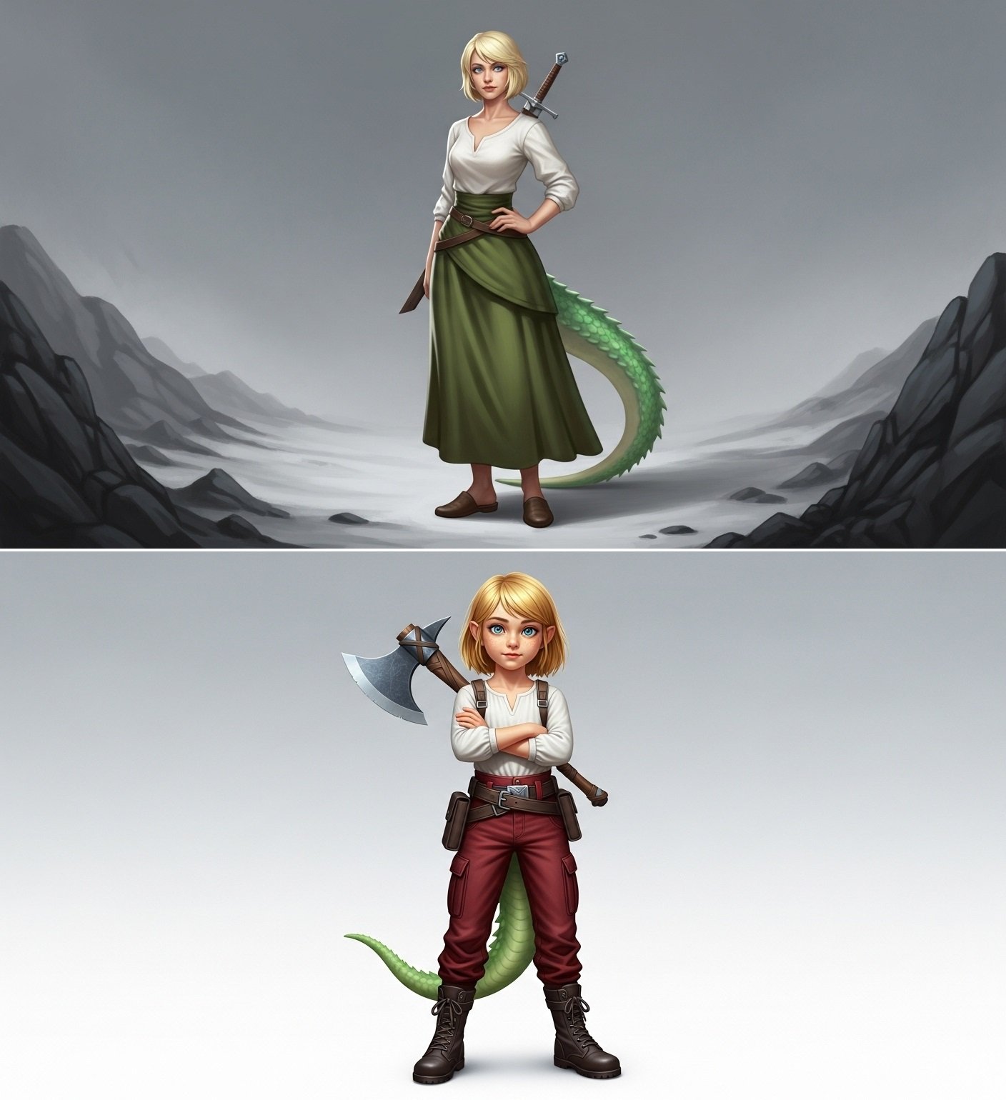 トカゲの尻尾がある。尻尾はスカートに隠れている。