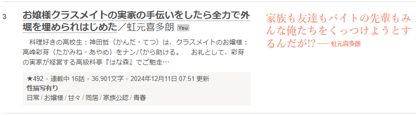 おかげさまで『お嬢様クラスメイトの実家の手伝いをしたら全力で外堀を埋められはじめた』が、ラブコメの日間ランキングで3位になりました!
