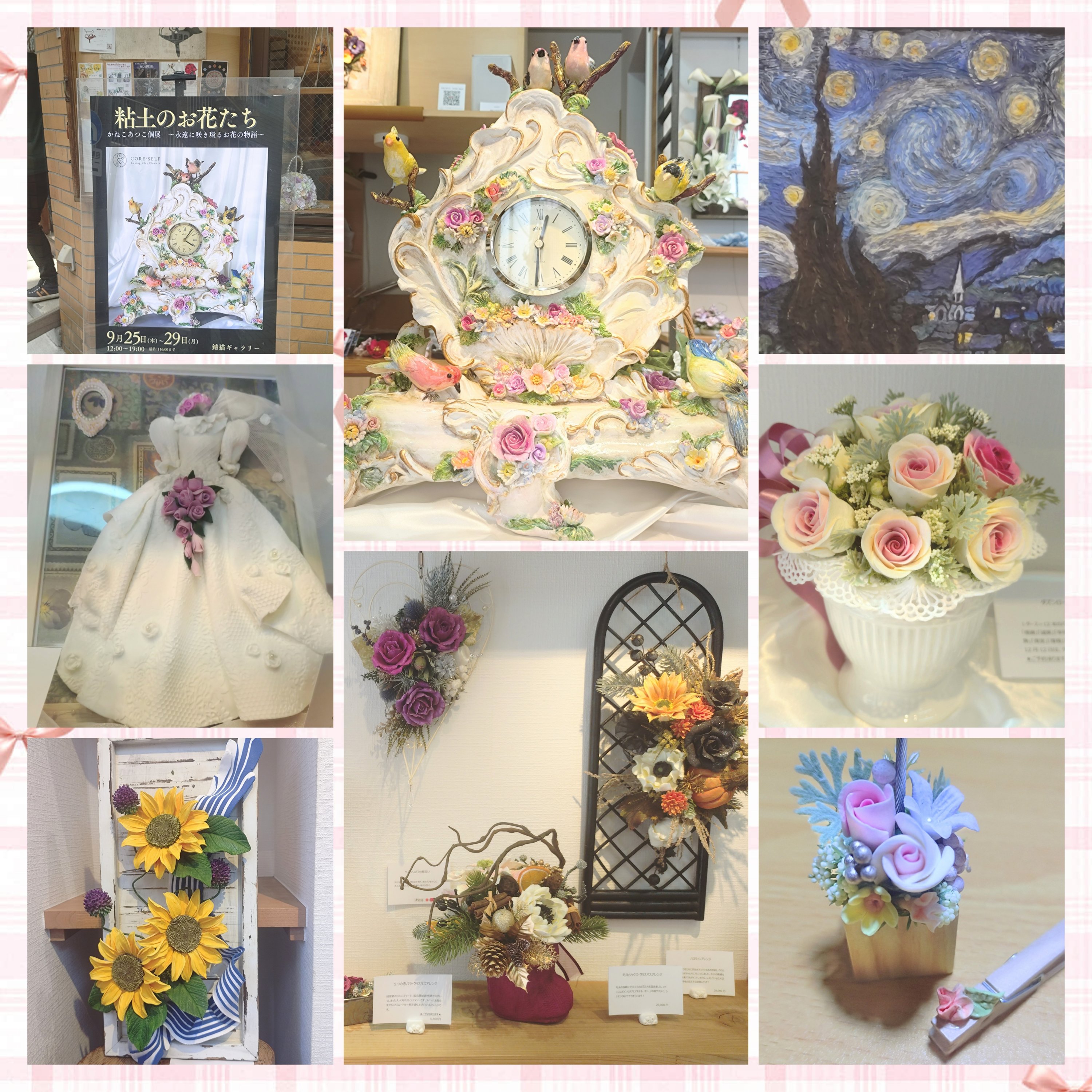 お花にドレスに小鳥さん。向かって右中央の写真のお花まわりにあるレース飾りも、おなじく右上の絵画も、ぜんぶぜーんぶ粘土なんですよ。