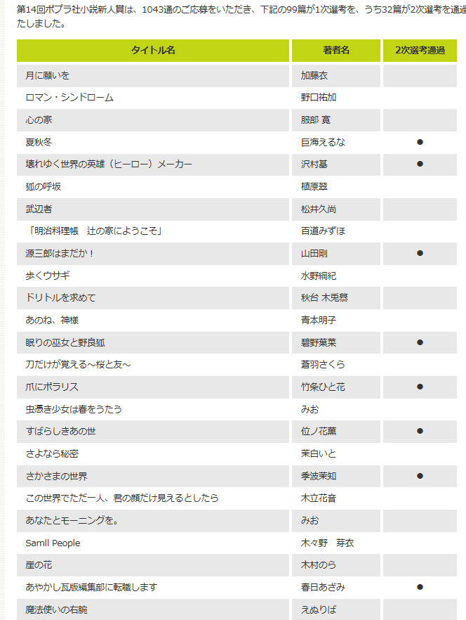 第14回ポプラ社小説新人賞の1次選考まで残りました