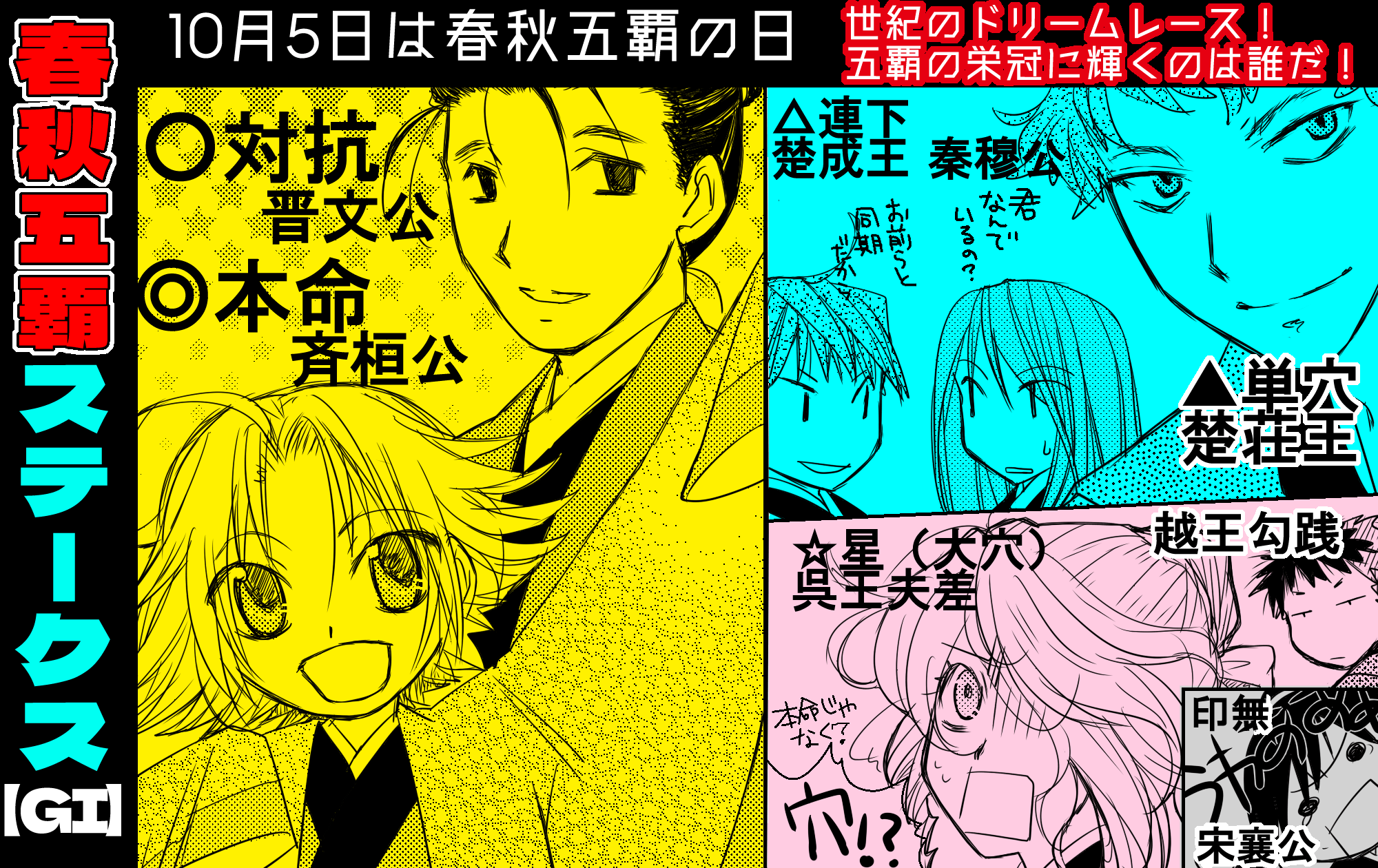 悲しいので、春秋戦国祭というツイッタ(X)タグ祭にあげた絵でも置いておきます。春秋五覇(だけど五人以上いる)です。