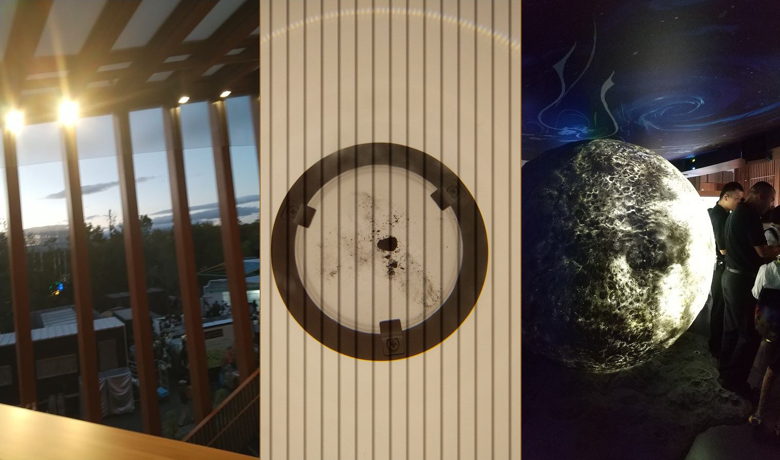 写真右:月の模型の前に立っているのが係の人で、向こうに並んでいる人のスマホで写真を撮ってあげています。