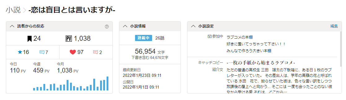 本日は、1/1から始めた作品「恋は盲目とは言いますが」のPVが1000を突破したことを