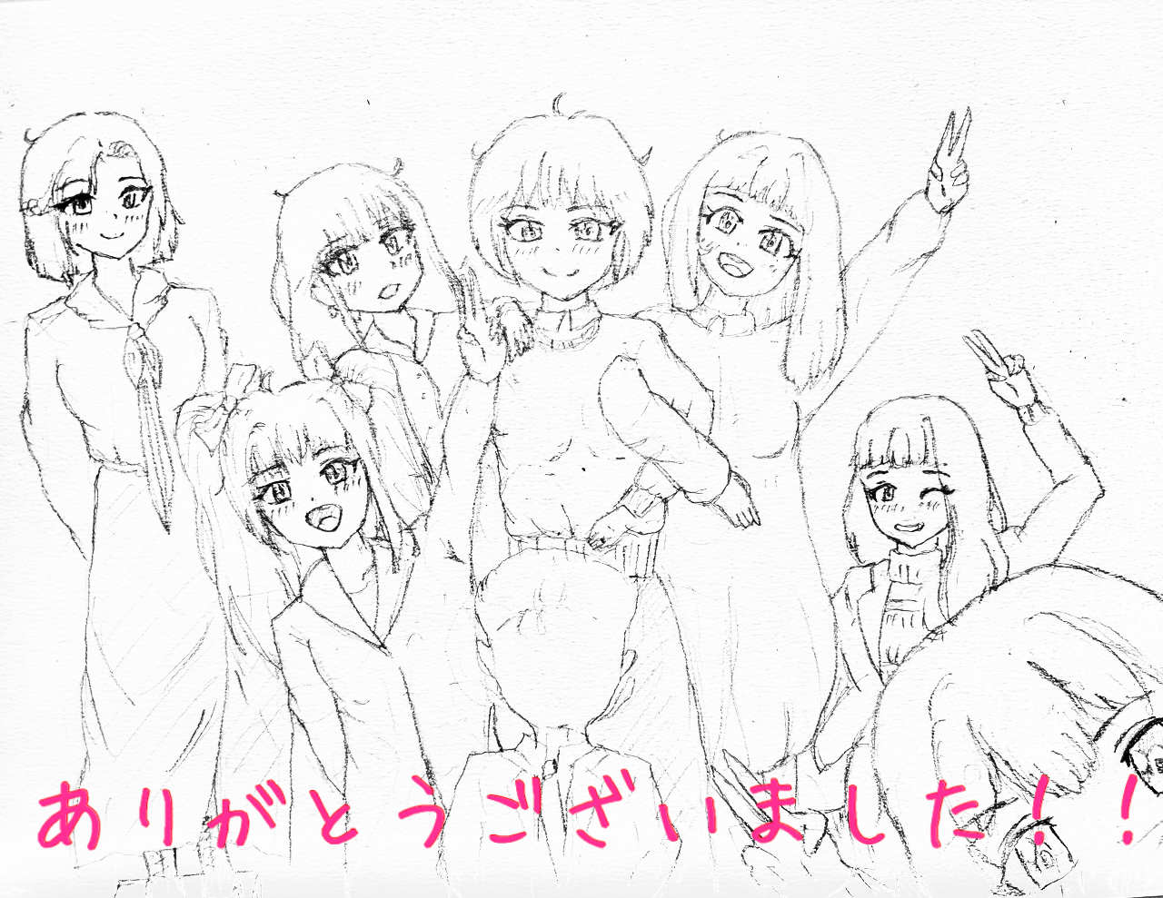 左から、さくら、ことは、綾乃、りんご、瑠衣、歌恋、正面おじさん、手前はツムギです。