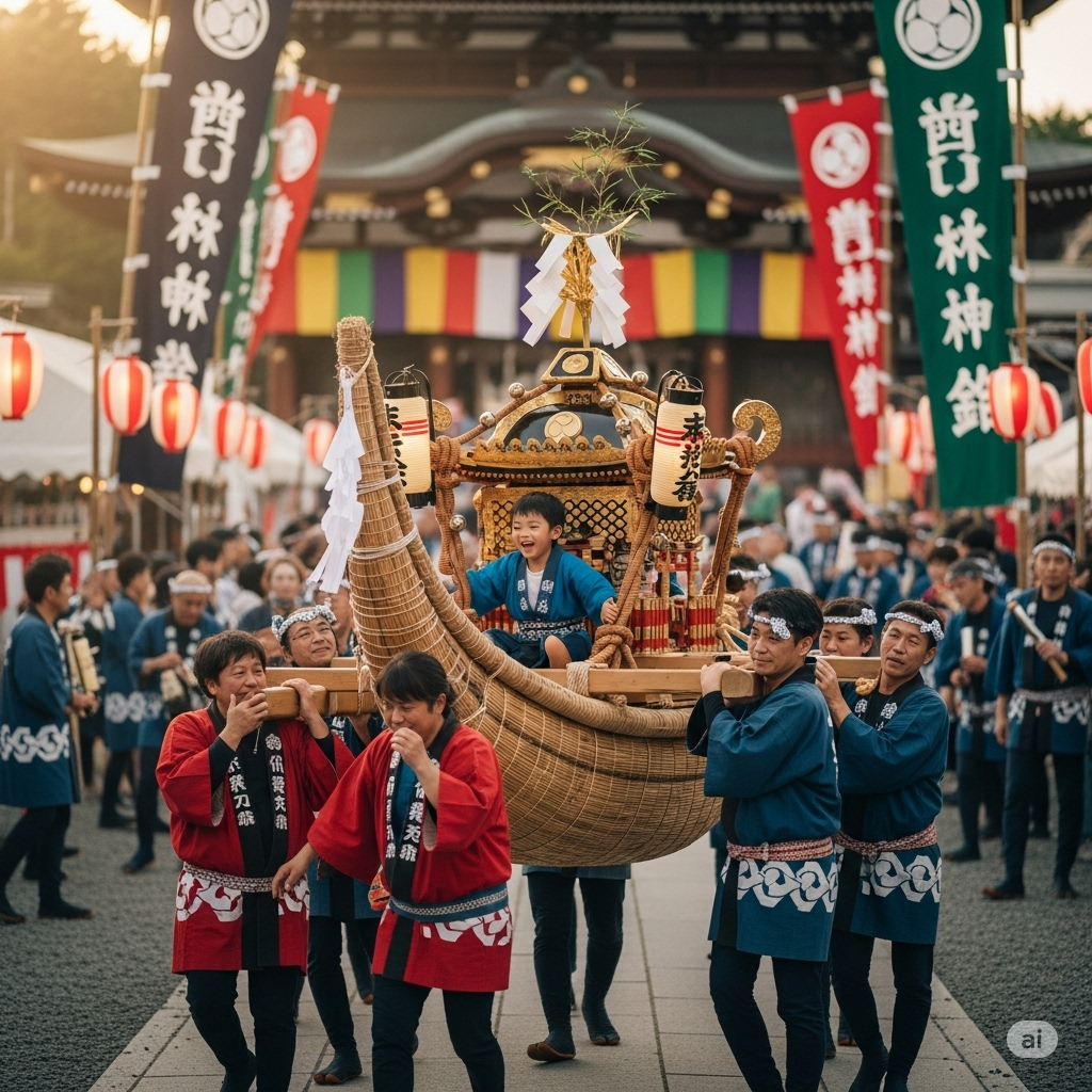 説明には「春の九十九太夫祭で葦舟神輿に子供を乗せて町中を練り歩く渡御の様子を、地域振興自治体であるゑびす会が撮影したもの」とある。
