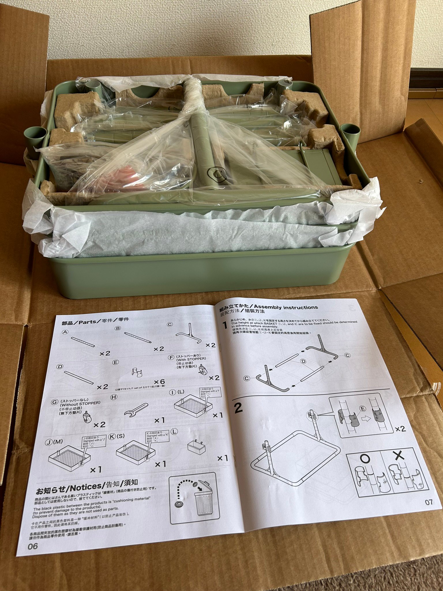 カゴの順番と、支柱の番号を混ぜないようにして、ストッパーと固定するものの向きを間違えなかったら出来るんじゃないかな?←箱の中身と広げられた説明書から読み解いたらしい