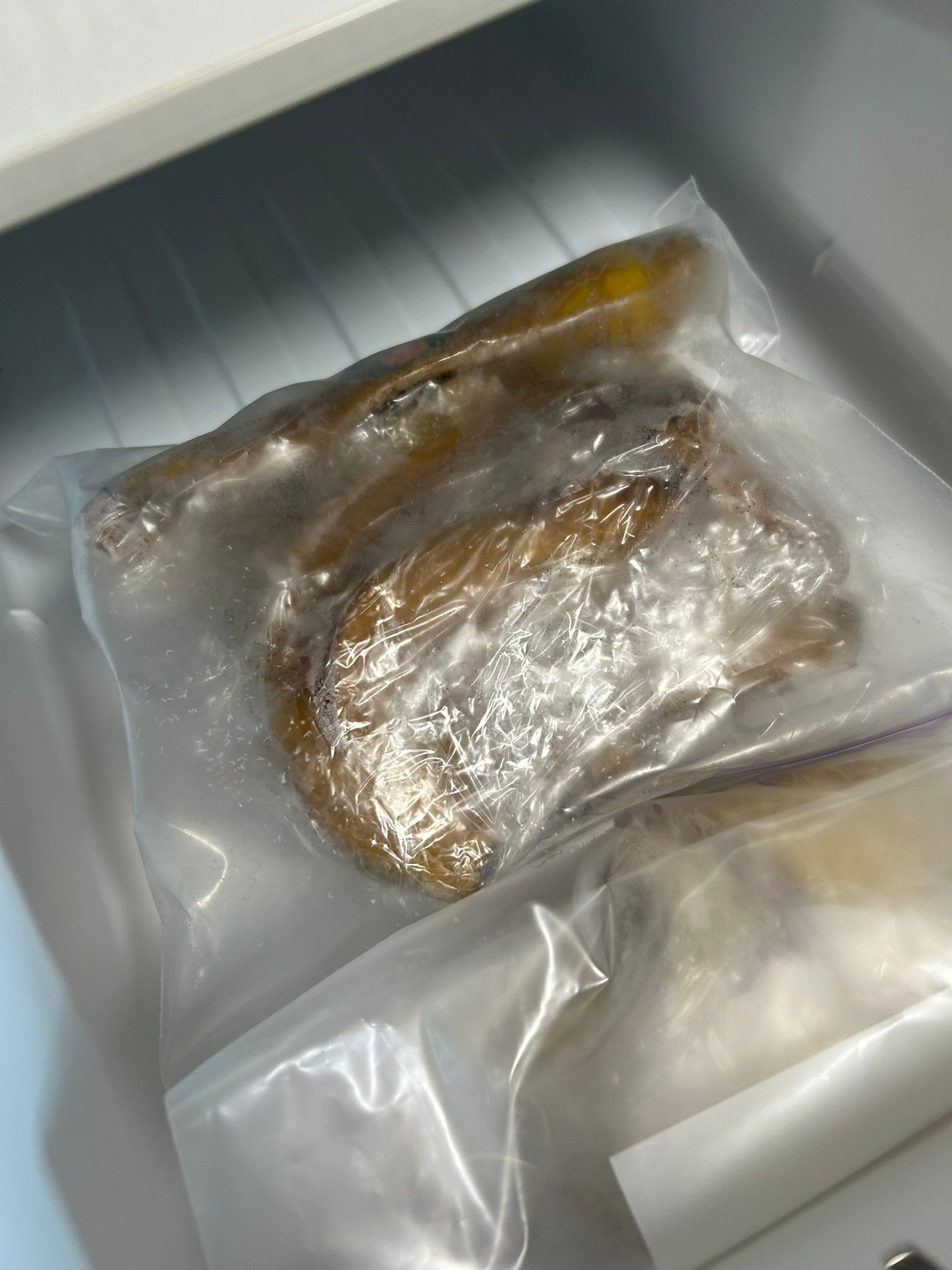 ①バナナや魚はラップに包みジップロックで冷凍庫に。(下記写真)