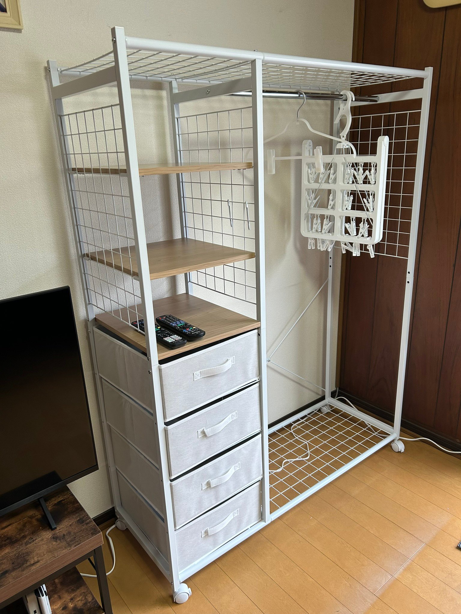 ハンガーラックですが、ハンガーの部分は洗濯のピンチをかけたかったんです。