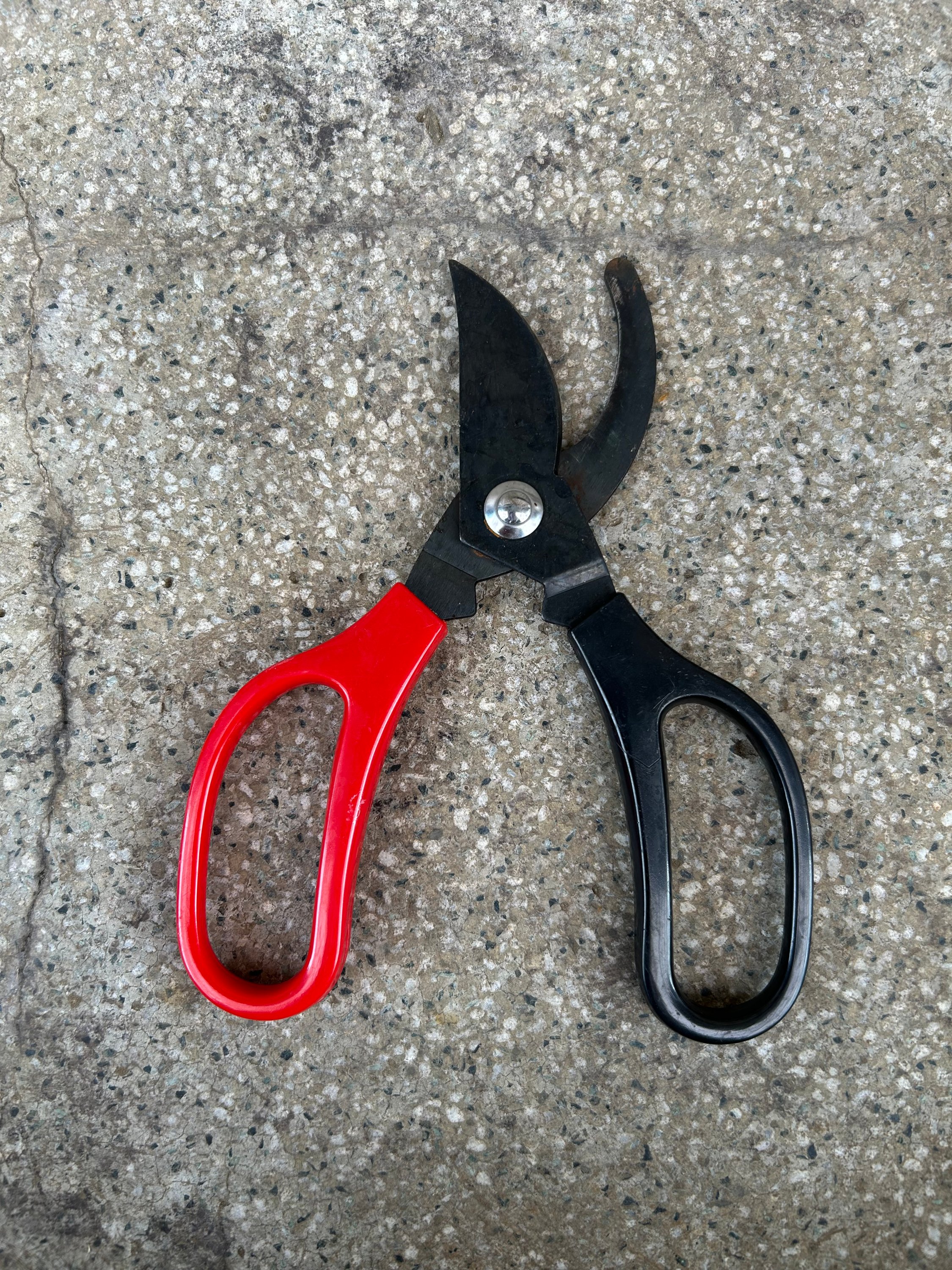 下の細いのを欠いて、上の方を切り込みハサミでちょんちょんして、真ん中辺は切り込みハサミでざっと枝を減らして、細かいところは剪定ハサミで切ればいいと思う