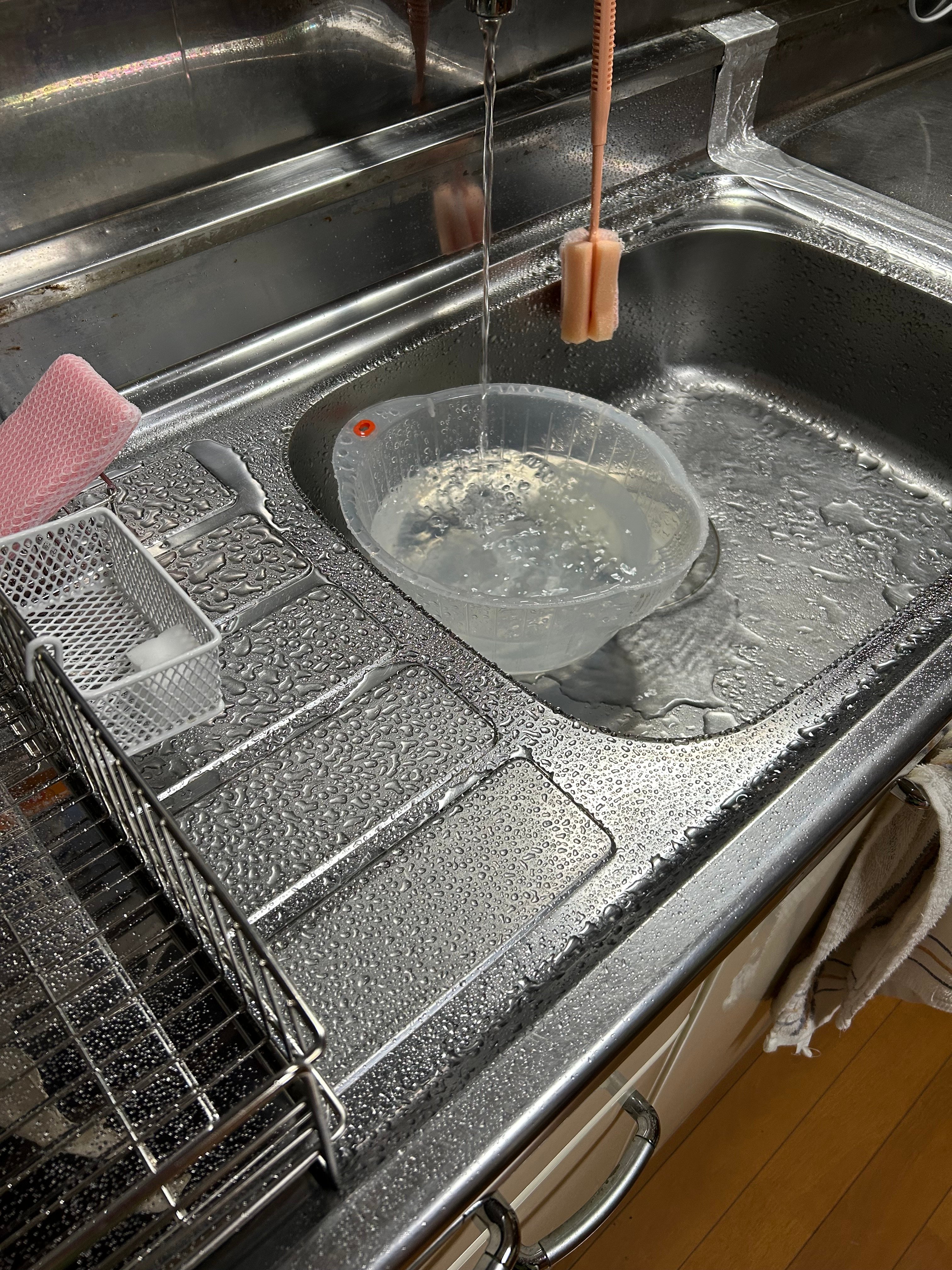 とりあえずうちにある一番深いボウルで受け止めましたが、水跳ねが酷い。