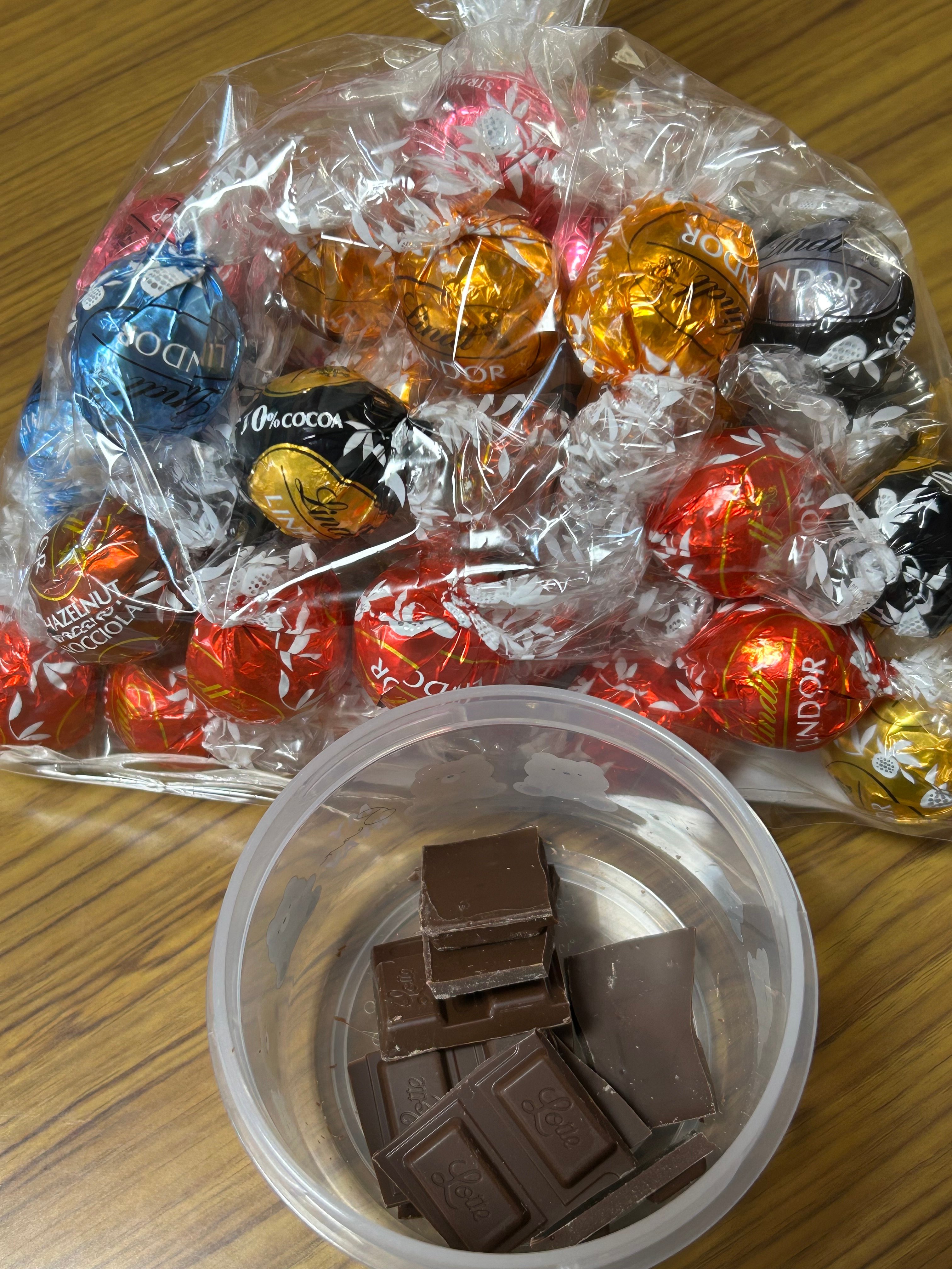 画像の下にあるのは、スーパーで購入した板チョコをわっかいて、毎日ちみちみと食べていました。