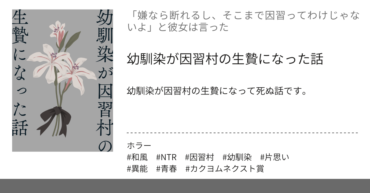 新作短編「幼馴染が因習村の生贄になった話」の掲載を始めました。