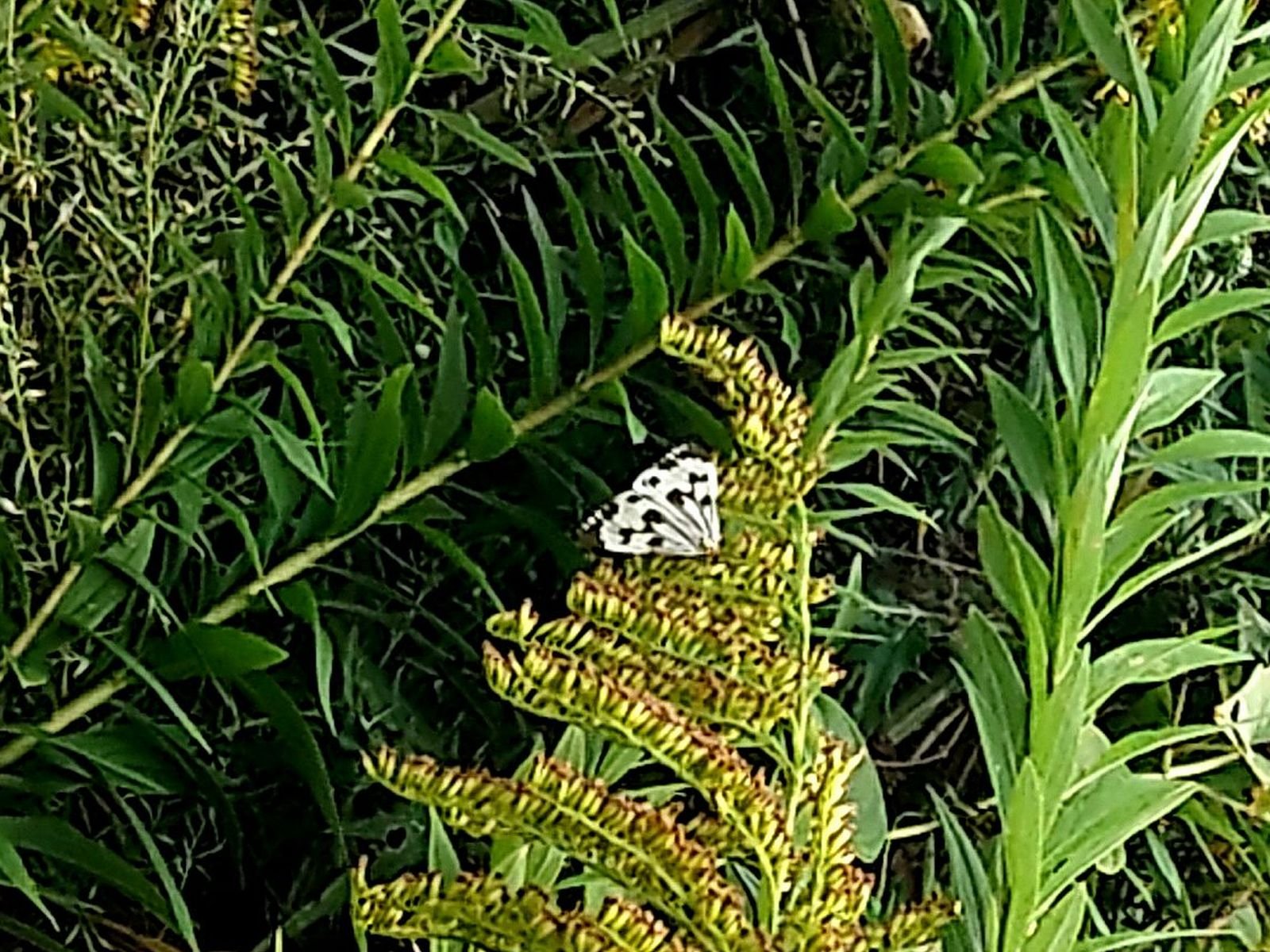 モンシロチョウの近縁種、スジグロシロチョウに似た昼に飛ぶガの仲間。