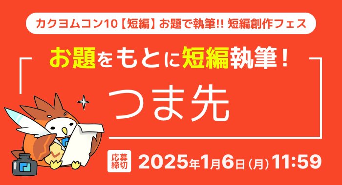 https://kakuyomu.jp/info/entry/kakucon10tp_odai_3【~2/3】「カクヨムコンテスト【短編】」複数応募キャンペーン&お題で執筆!! 短編創作フェス開催!