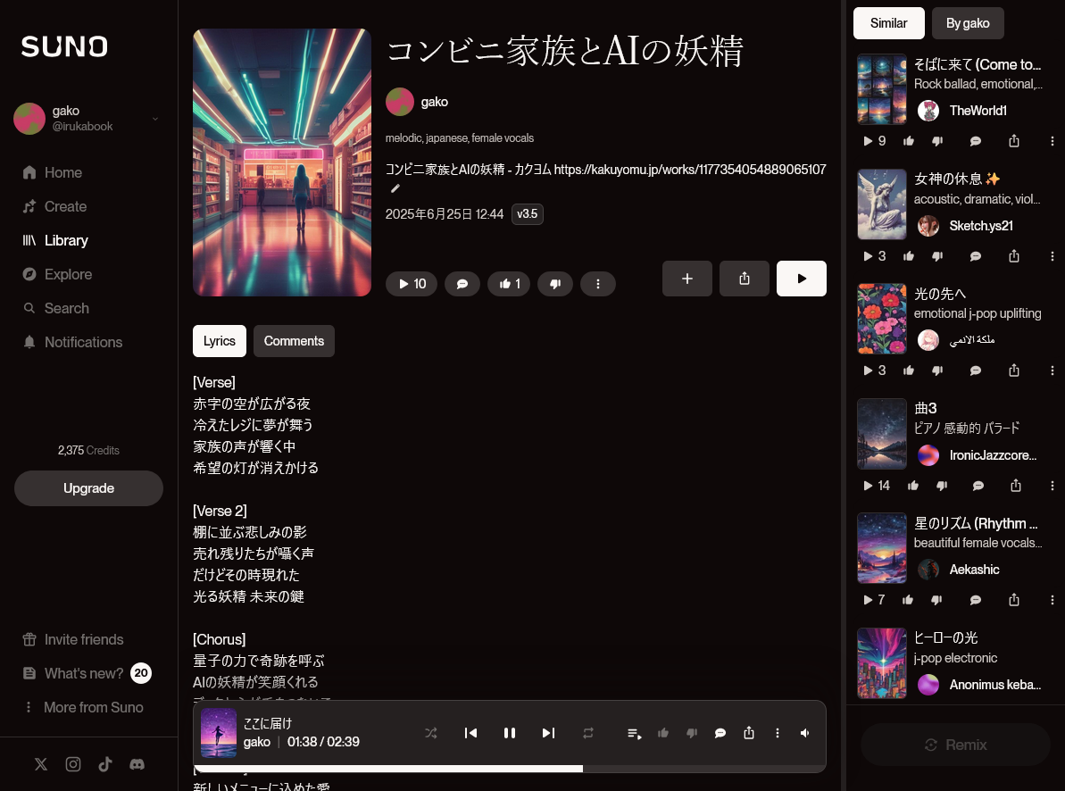◇ 「コンビ二家族とAIの妖精」のストーリーで音楽生成すると、やたらと面白い歌詞ができるw