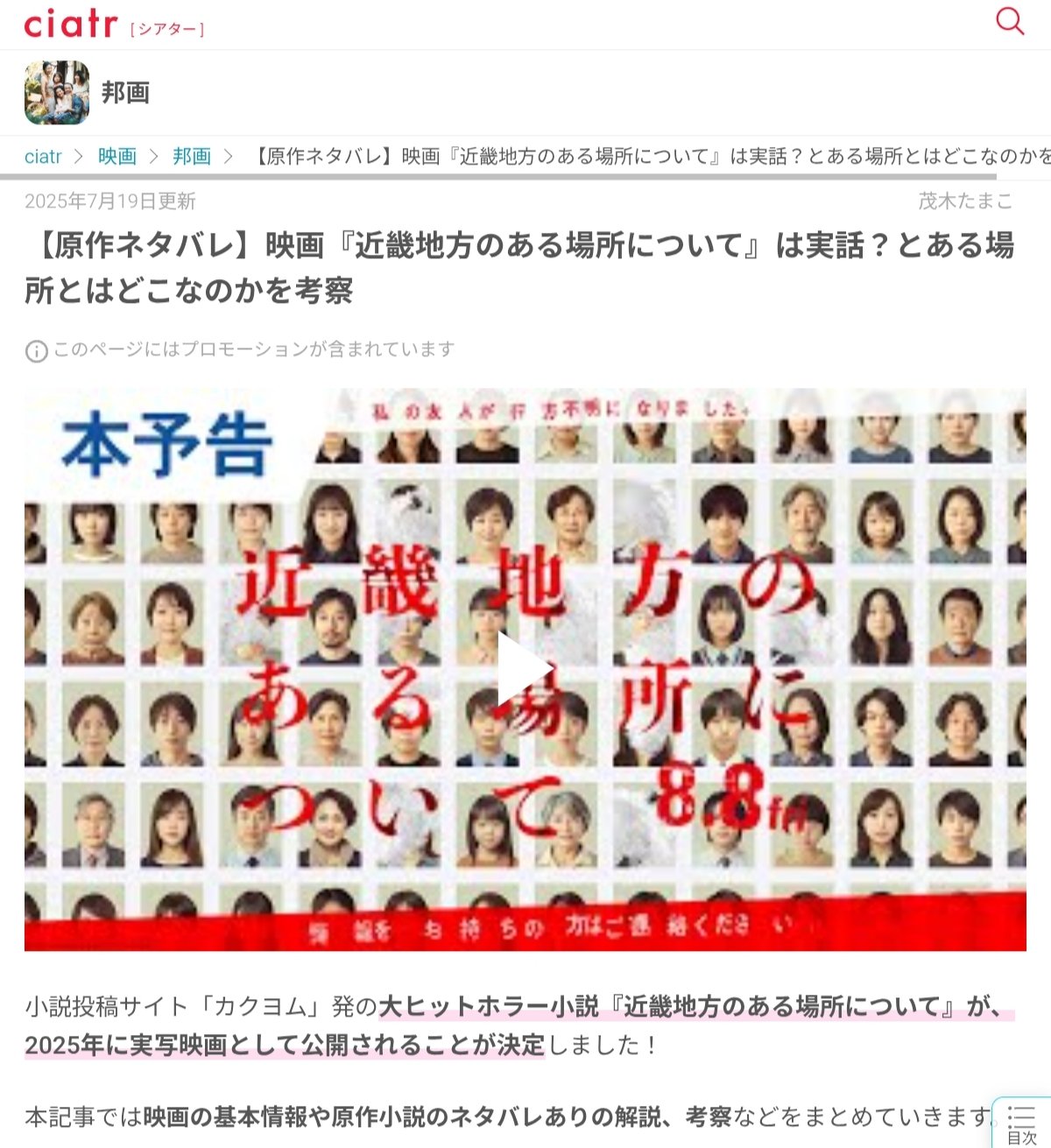 https://ciatr.jp/topics/331418『近畿地方のある場所について』ネタバレなし感想、これはドラマ化したい - カクヨム