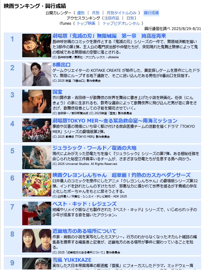 『劇場版「鬼滅の刃」無限城編 第一章〜』が7週連続1位!新作は2位に『8番出口』、7位に『ベスト・キッド〜』がランクイン(2025年8月29日-8月31日)(2025.09.01)