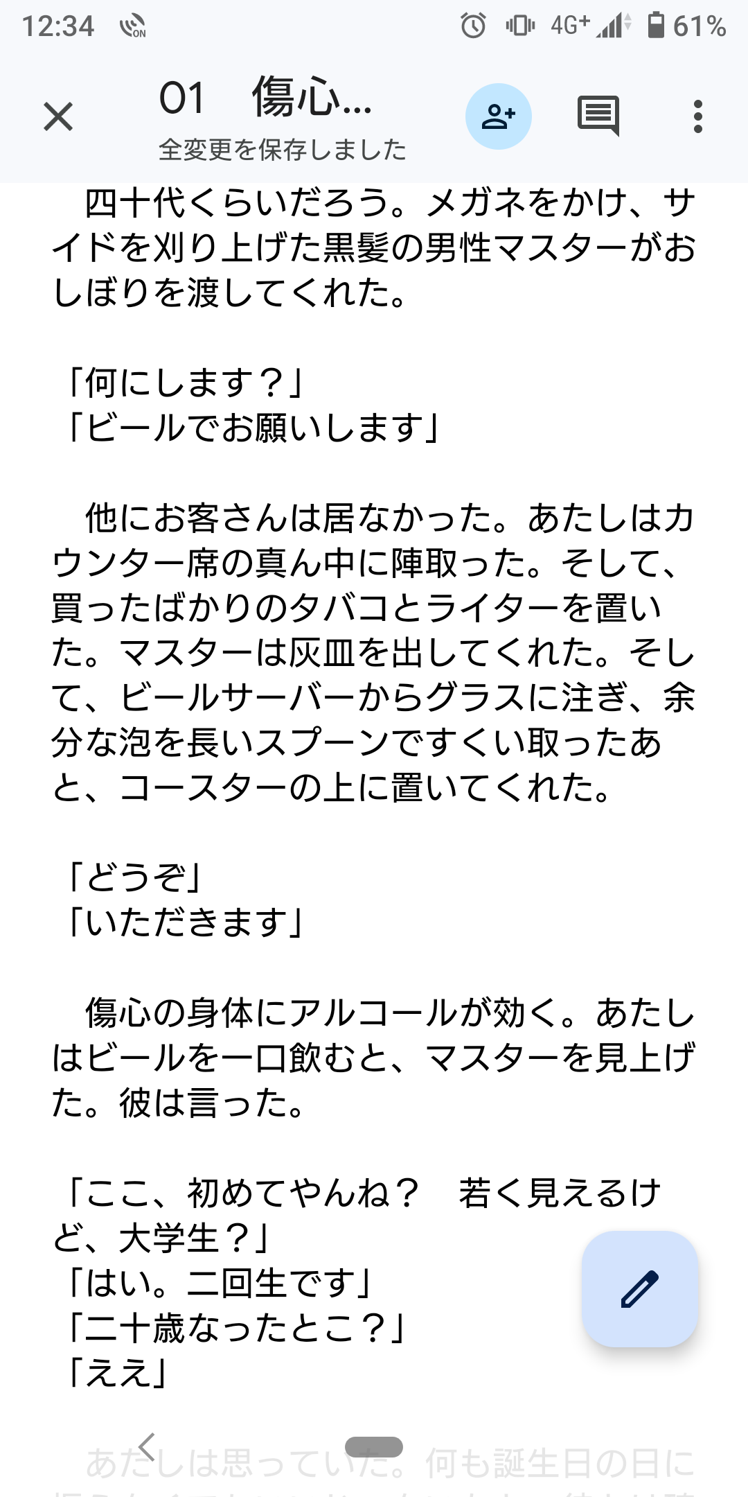 今日はスマホでぽちぽちと執筆をしている惣山です。新作の冒頭部分のスクショを添付しました。こんな感じで進めます。「二年生」ではなく「二回生」と発言しているところもポイントです。関西では大学の学年をそう表現するところが今でも多いです。