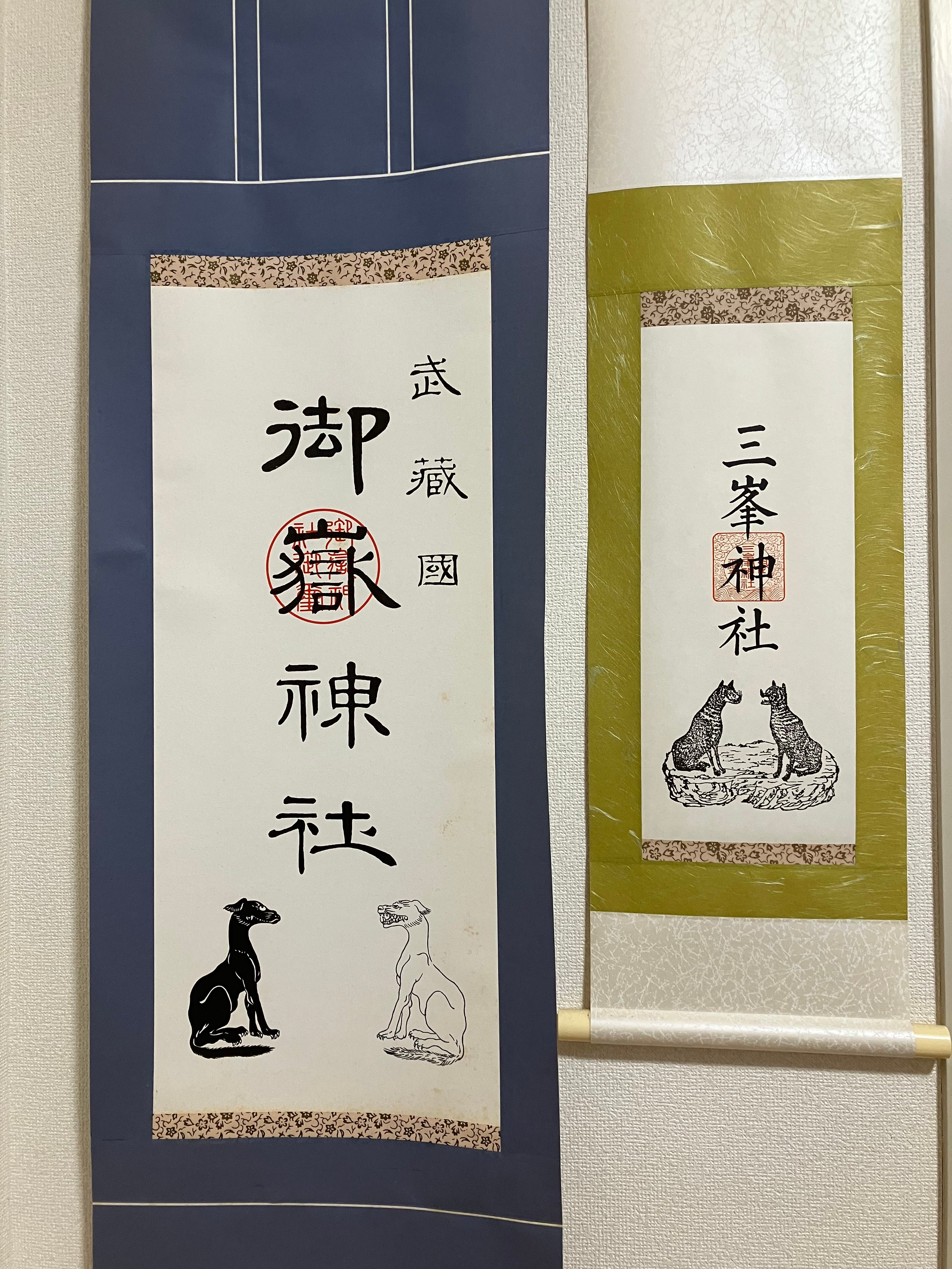 ↓はモデルになった御嶽神社の掛け軸です。真っ白と真っ黒の山犬兄弟はここからインスピレーションを得ました。