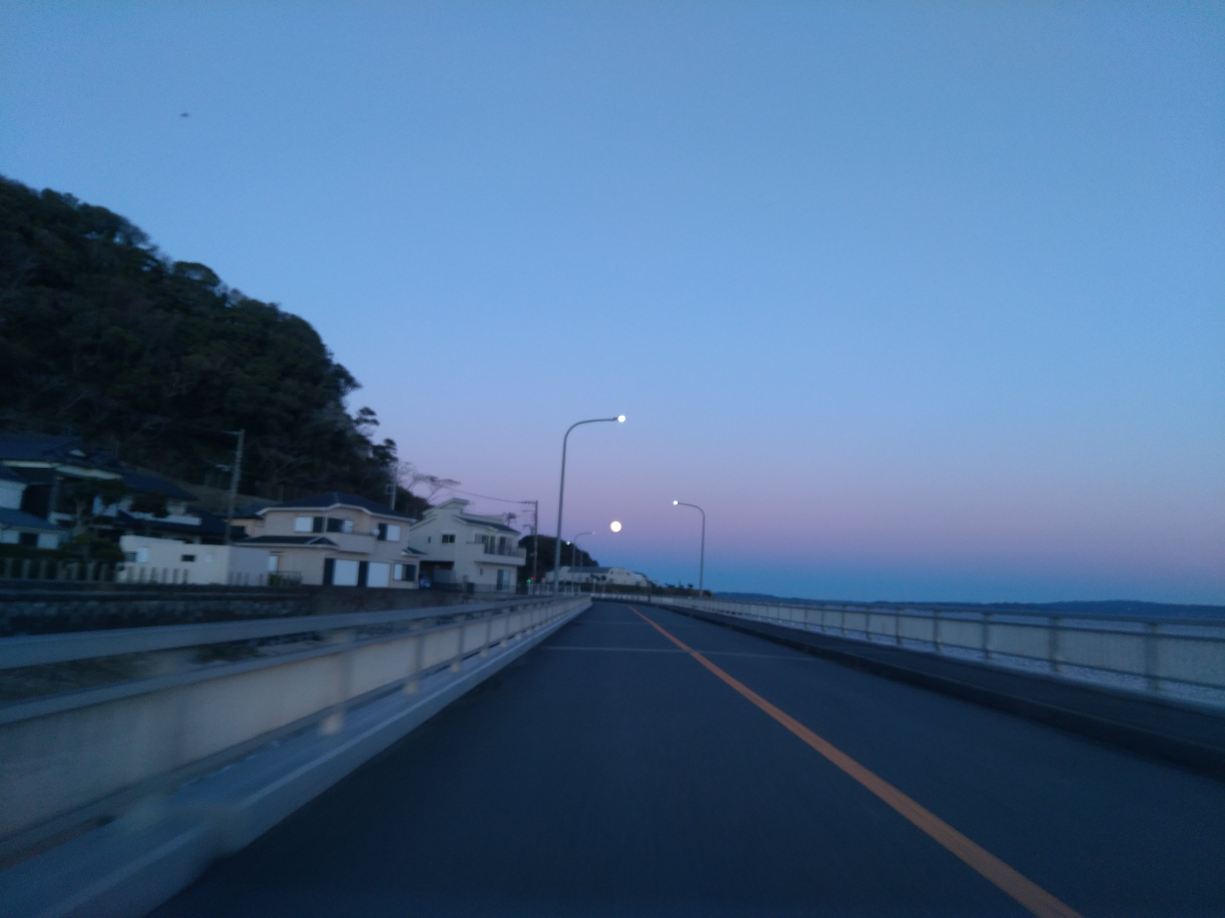 これは、ちょうど月が上ってきている東の空なのです。場所は三浦半島ですねー。このピンク色は最近よく見るのですが、がっさがさの心が癒されます。