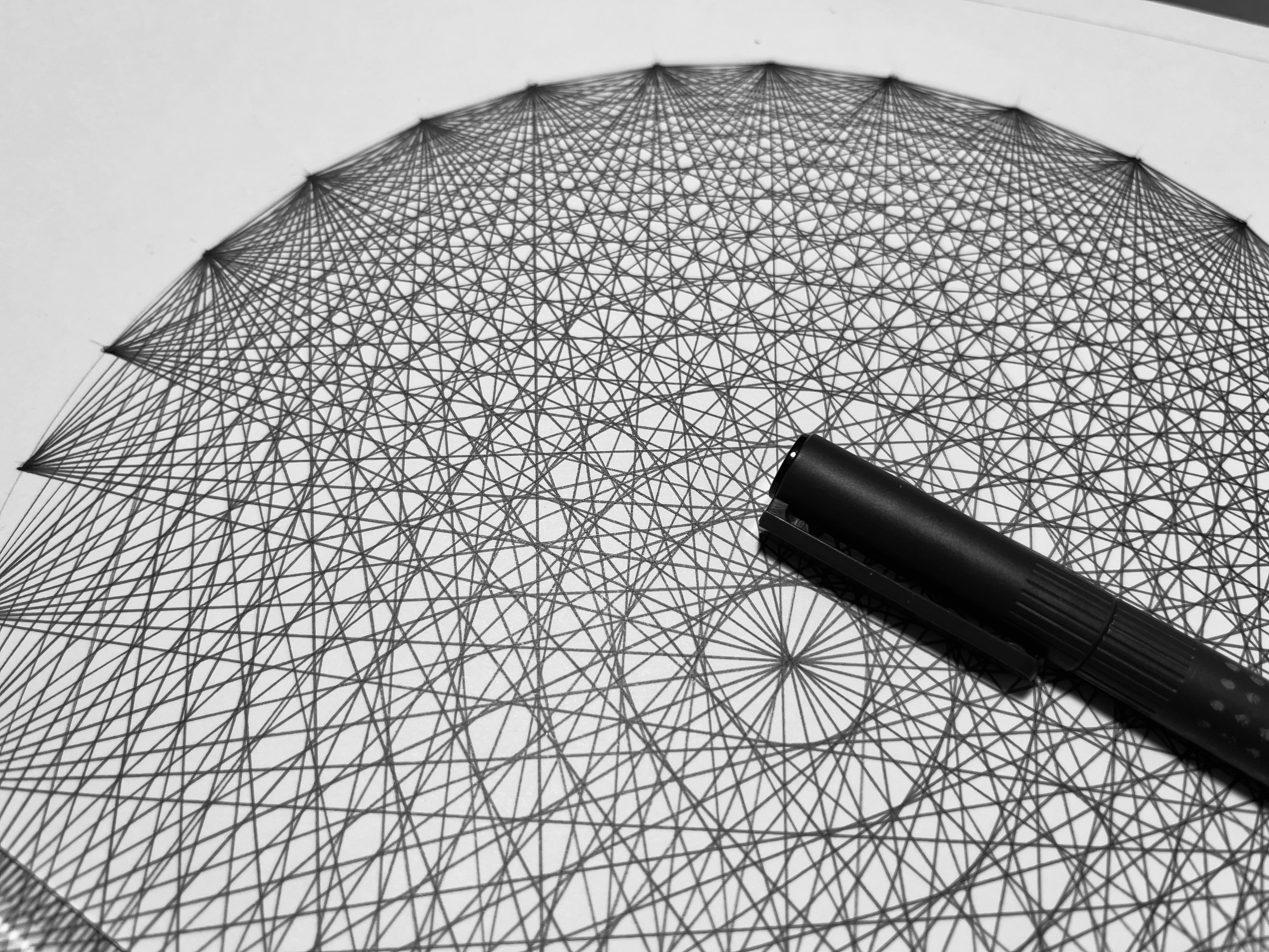 円をかいてそれを三十二等分して、円の上に点を打っていって、その点から他の全ての点に線を引くとできますよ~!