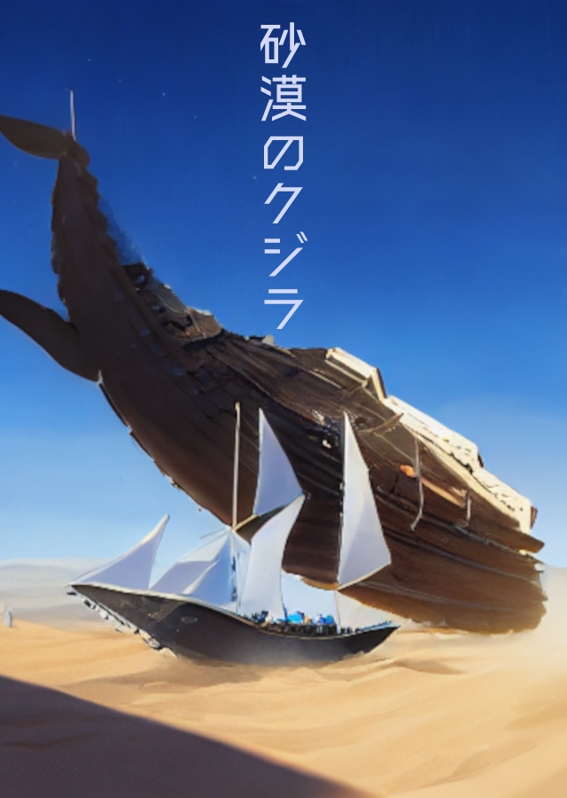 waifu diffusionを使って、ざっくりtxt2imgで「機械のクジラ」と「砂漠を走る船」を作って、それをクリスタ上でペタペタ貼り合わせたあとでimg2imgをして作りました。