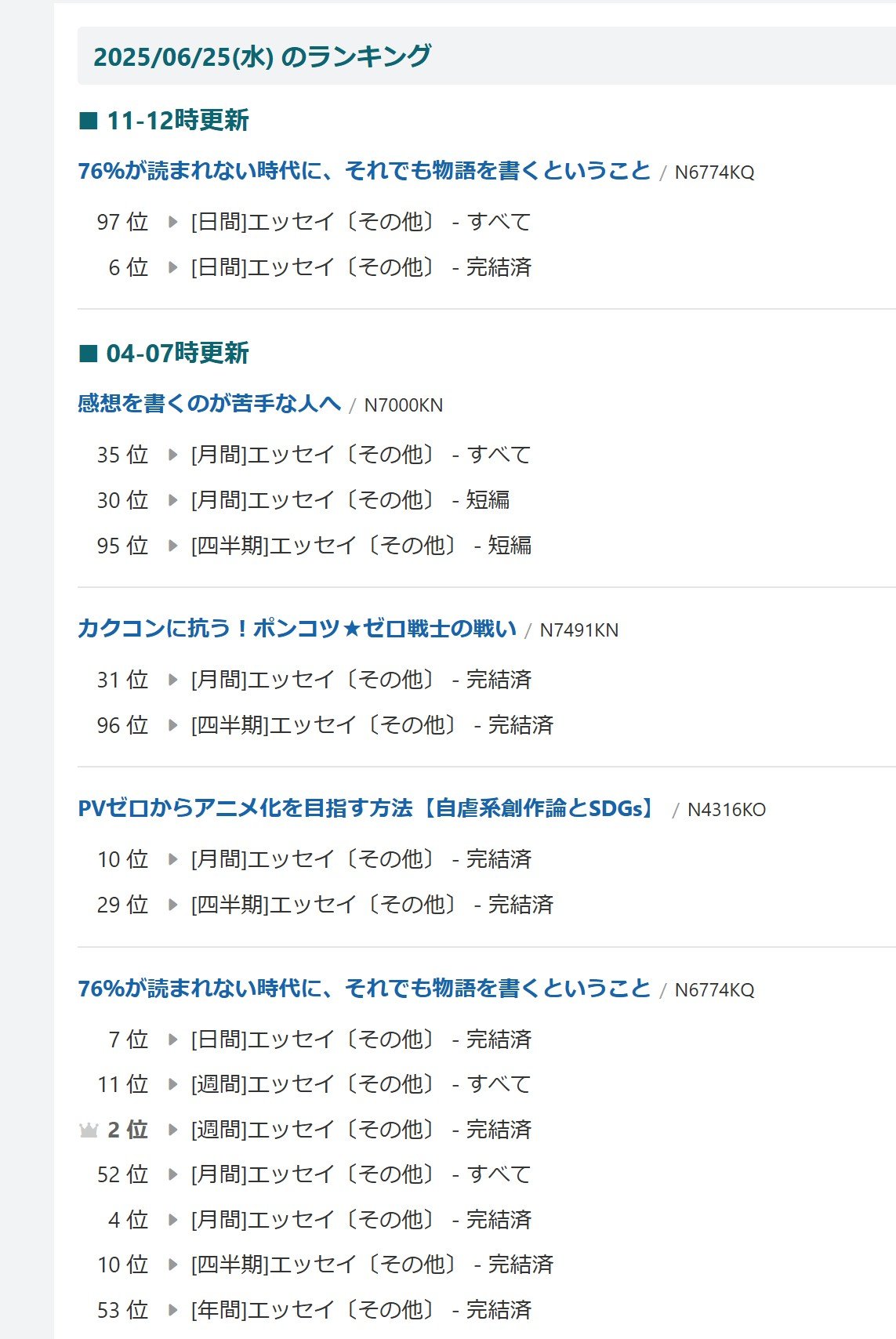[6/25]小説家のなろうのエッセイの順位