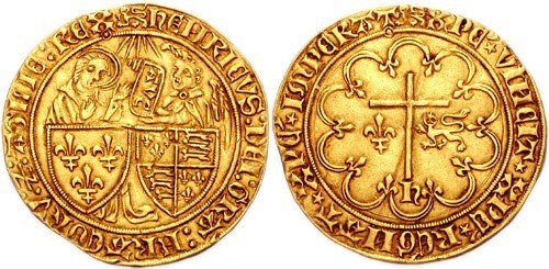 サリュドール金貨(Salut d'Or):トロワ条約で王太子(シャルル七世)が廃嫡され、イングランドがフランスを統治していた1422〜1453年に発行。イングランドの支配地域(フランス北部)で流通していた。