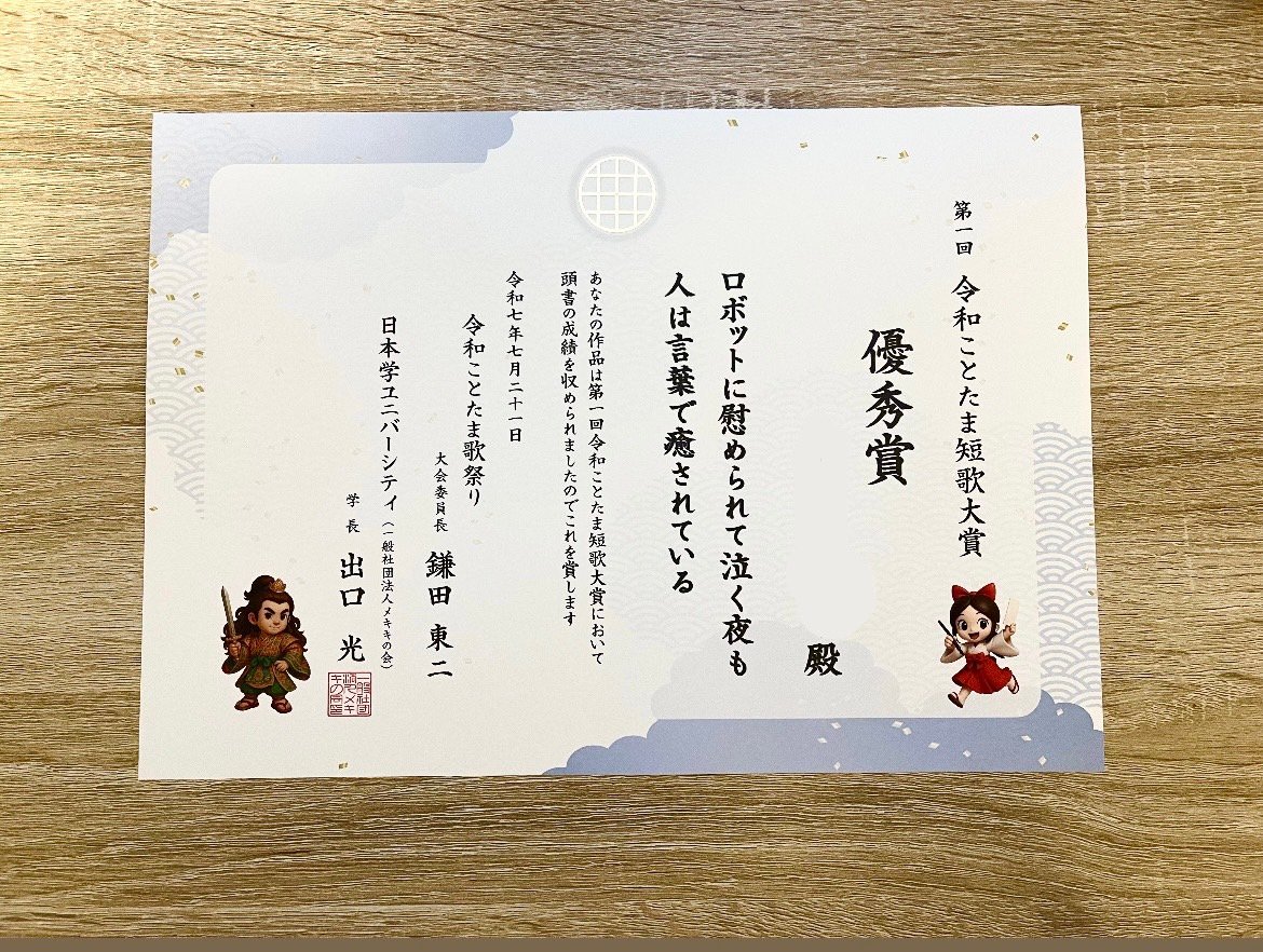 このたび、「第1回令和ことたま歌祭り」にて、身に余ることに優秀賞を頂きました。